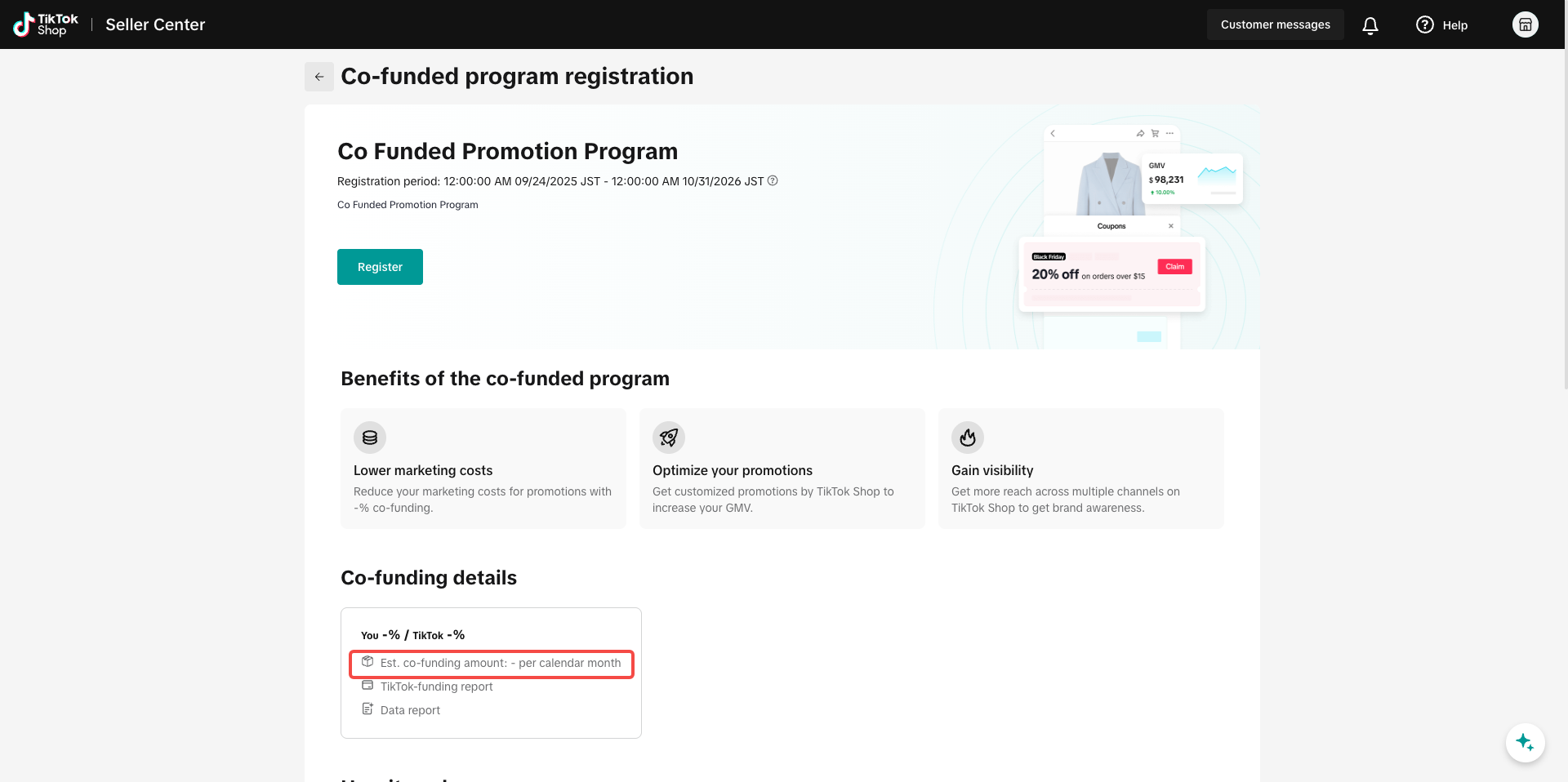 商家成功注册后,TikTok Shop 将运用先进算法进行战略性营销资源分配,旨在最大化GMV和投资回报率ROI。包括ROI在内的所有绩效指标平台将每日更新,确保投入效果的透明度,而预计合资金额将基于过往数据每月更新。