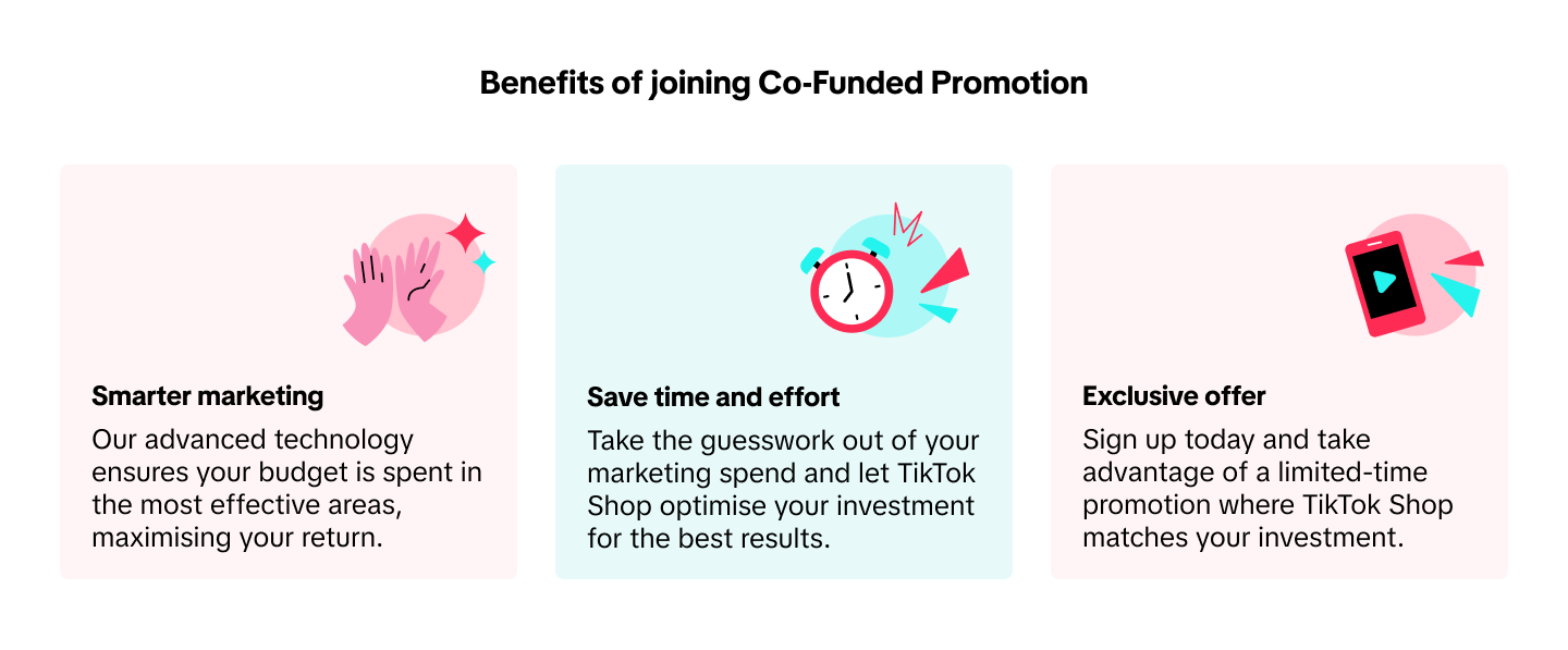 合资推广计划是TikTok Shop推出的合作项目,由平台与商家共同出资营销资金,并由TikTok平台通过先进算法进行战略性资源分配,将资金精准投放于商品券、新客专享折扣等营销活动。项目所有资金均由平台统一运营管理,旨在最大化商家的投资回报率ROI。