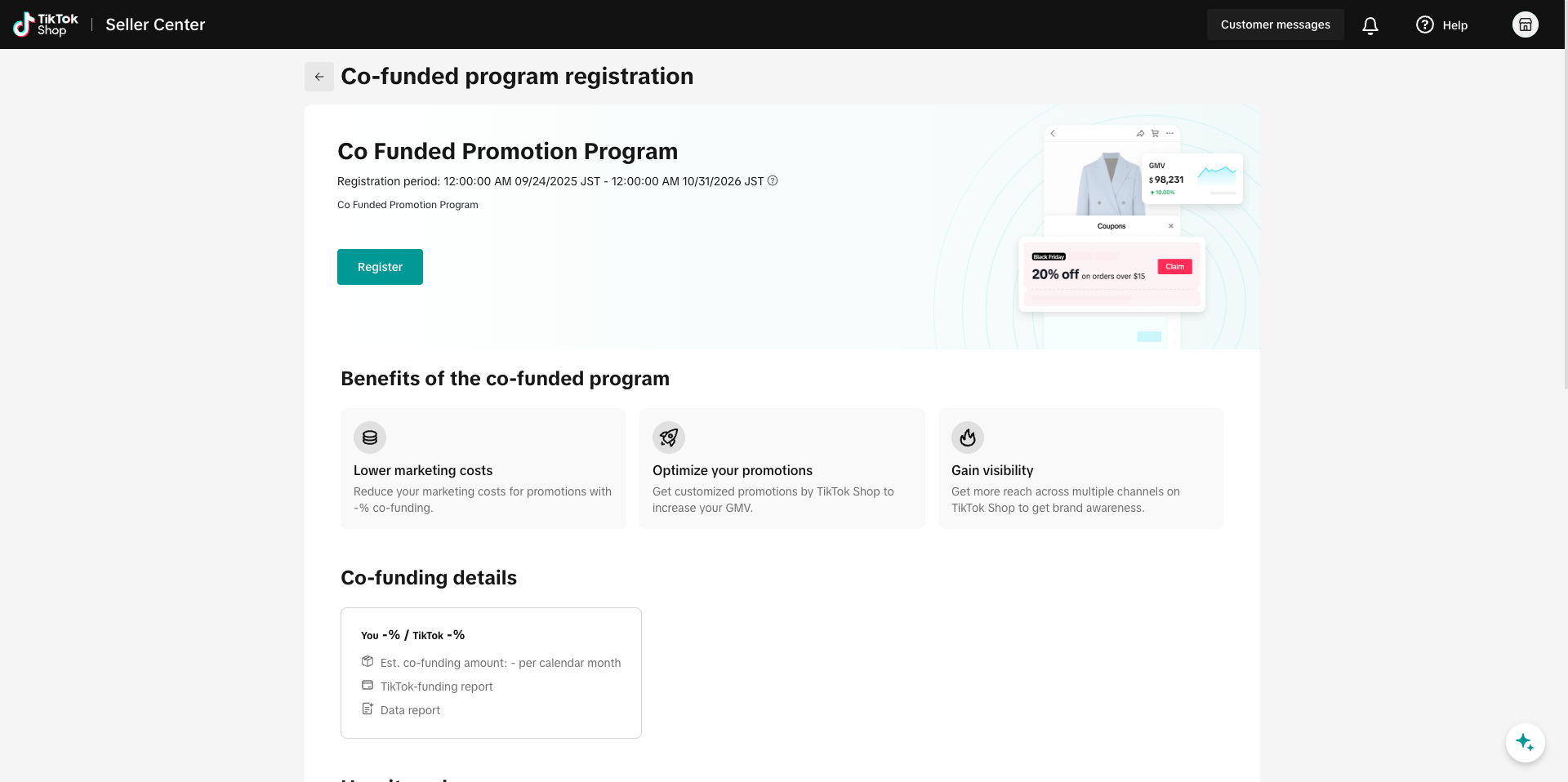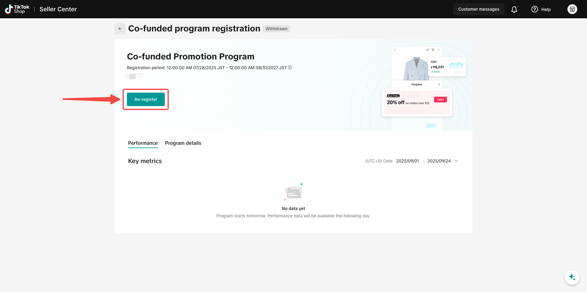 从商家中心进入营销中心 > TikTok资助计划 > 合资计划 > 重新报名