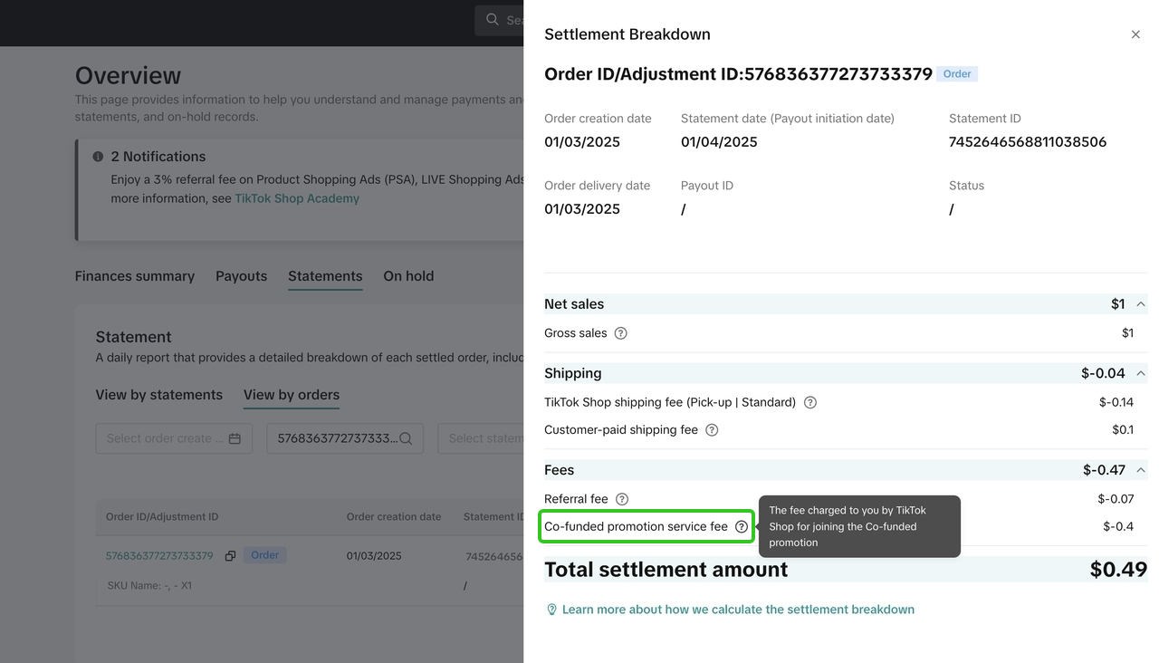 您无需预付任何费用。TikTok Shop将预先垫付推营销活动产生的费用,商家合资的部分将在标准结算周期(通常为商品妥投后1-8天)内进行统一结算。相关支出将在账单中显示为「合资营销服务费」。