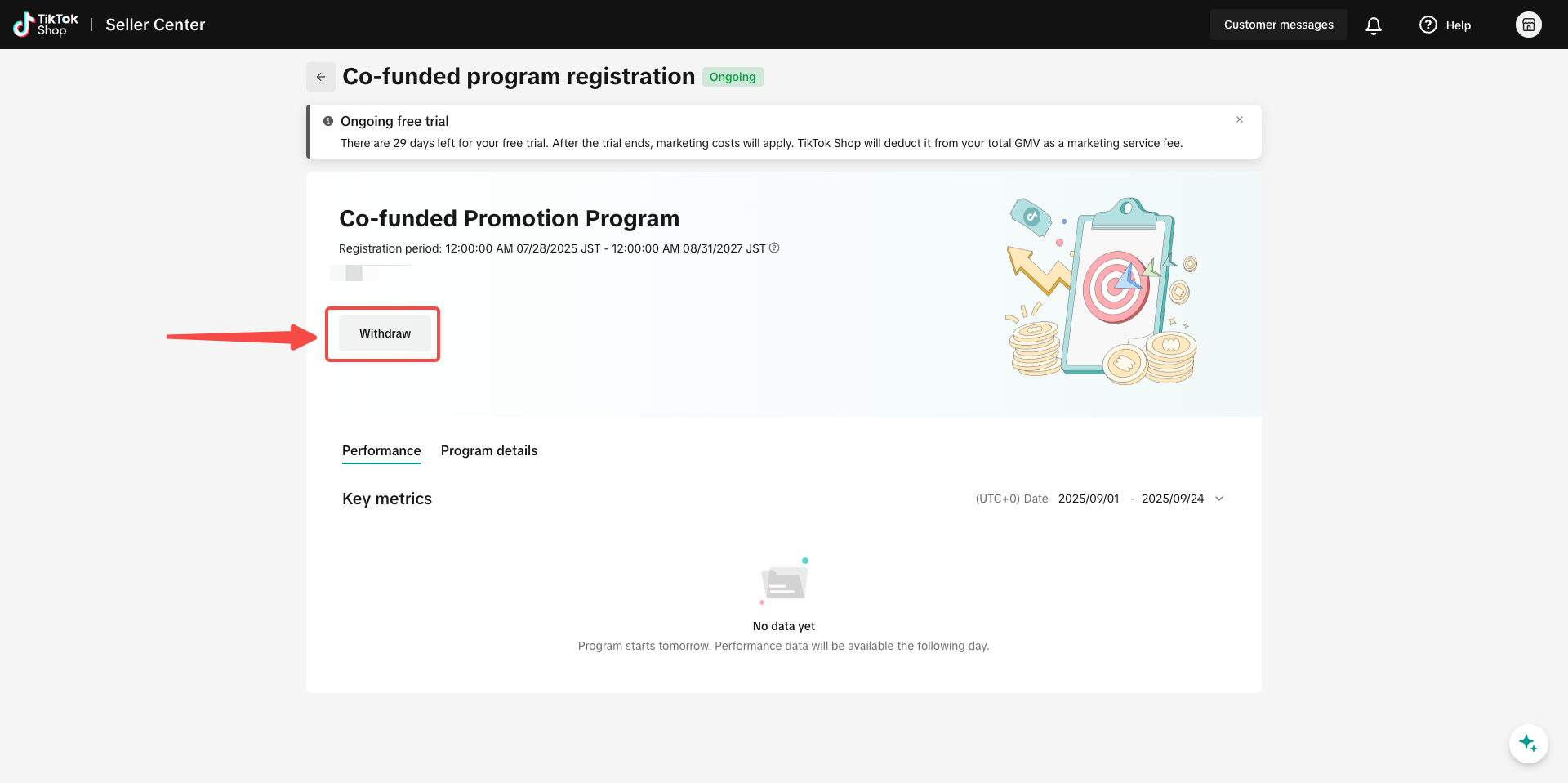 从商家中心进入营销中心 > TikTok资助计划 > 合资计划 > 点击 「开始免费试用」开通