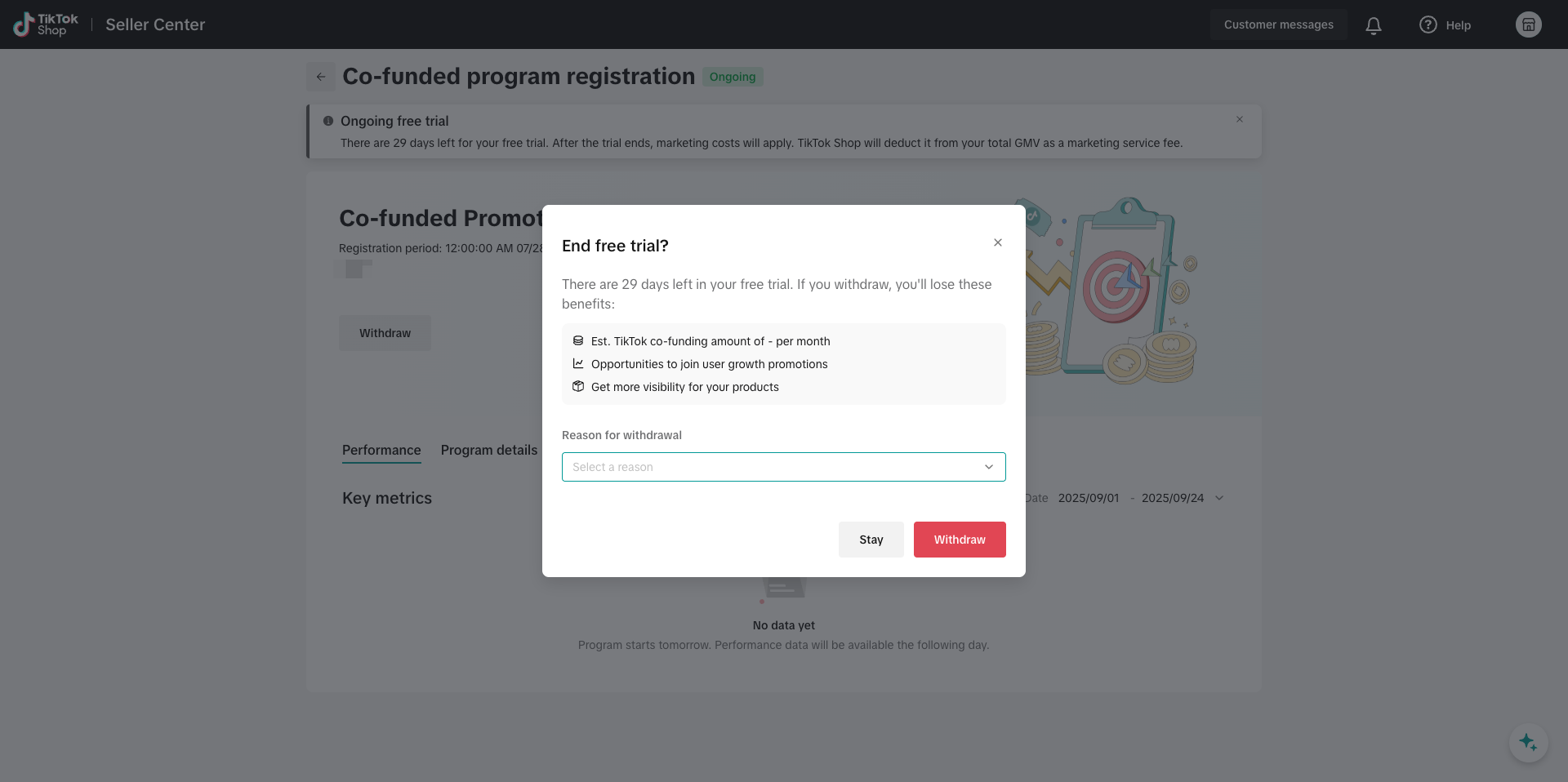 可以,您随时可前往「管理计划」点击退出按钮,退出后所有营销活动将立即停止。若您后续希望重新加入,需手动前往:营销中心 > TikTok资助计划 > 合资计划 > 重新注册。