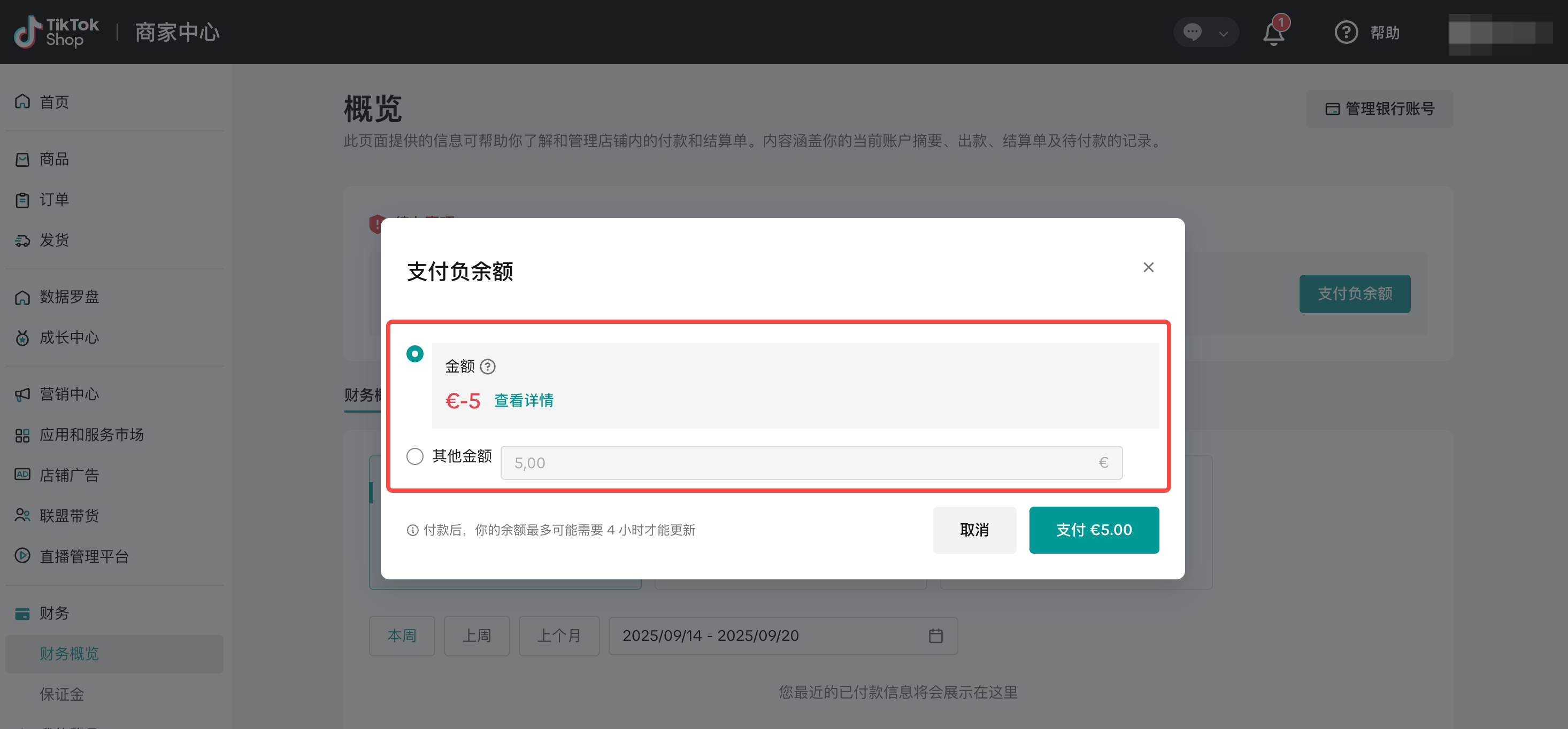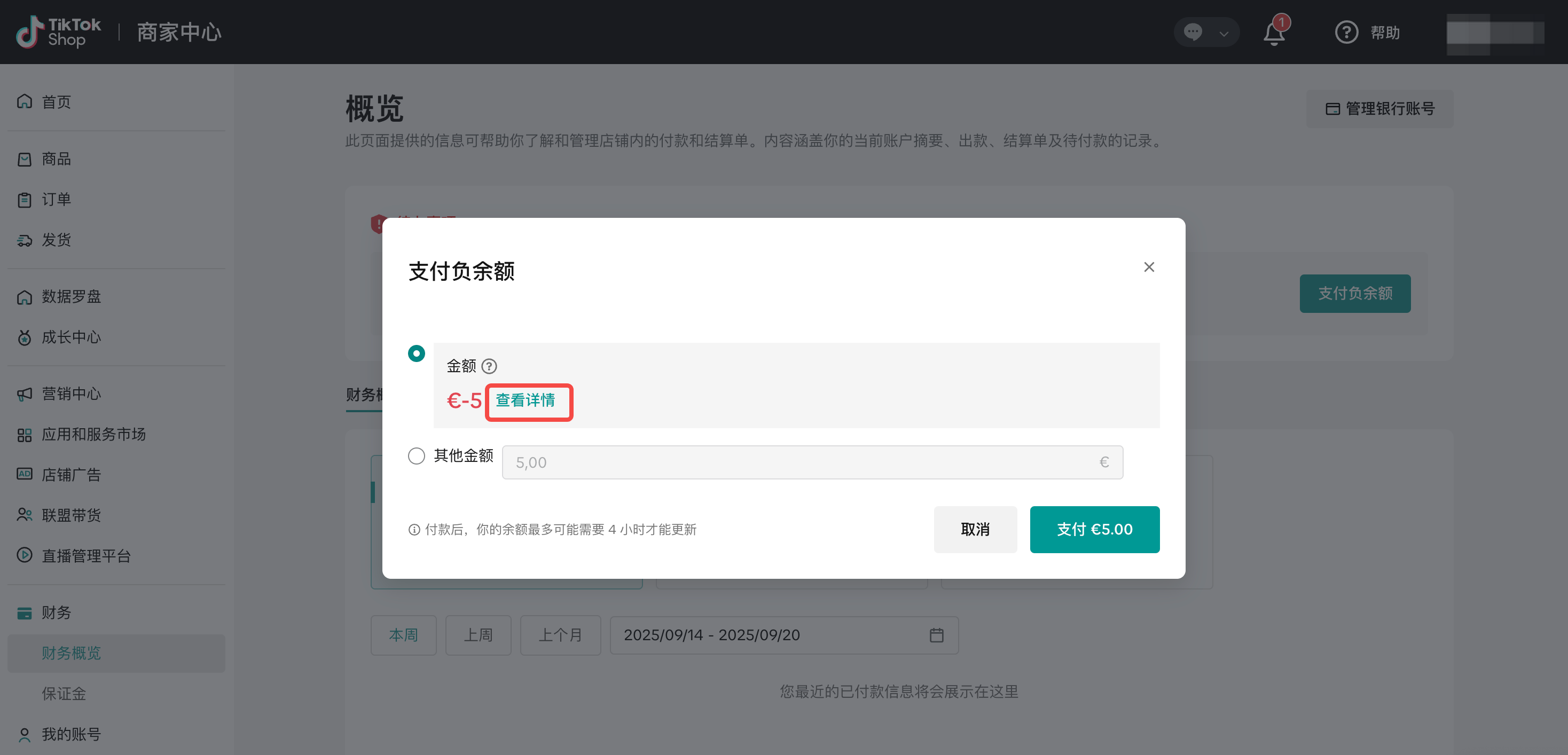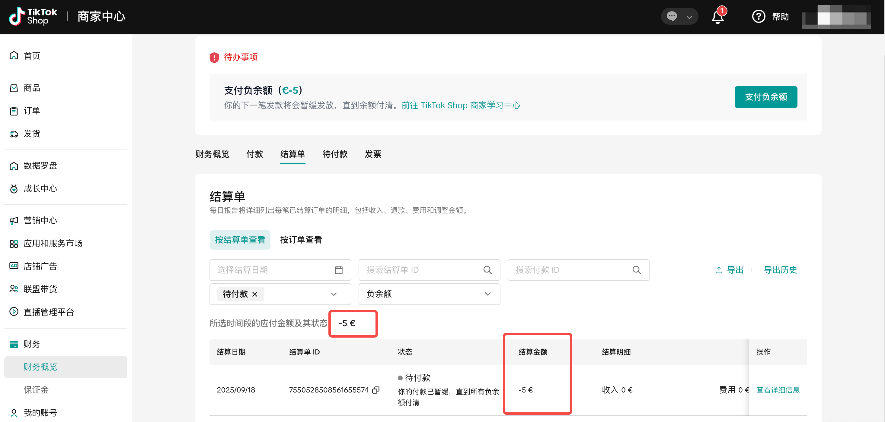 当结算周期内各种平台费用或退款超过店铺收入时,就会出现负余额。