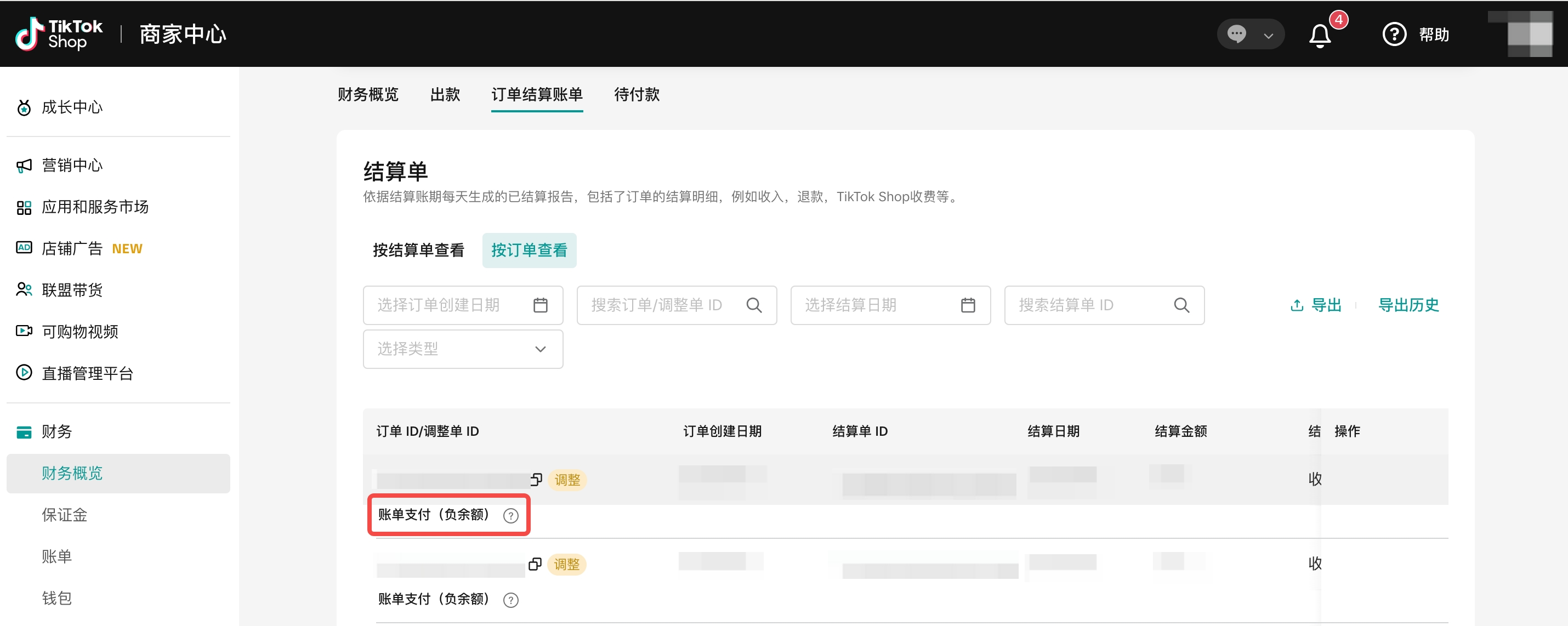 | 第7步 | 次日,支付记录将同步至订单结算单账单,调整项标注为“账单支付(负余额)”。 | ![]() ![]() |