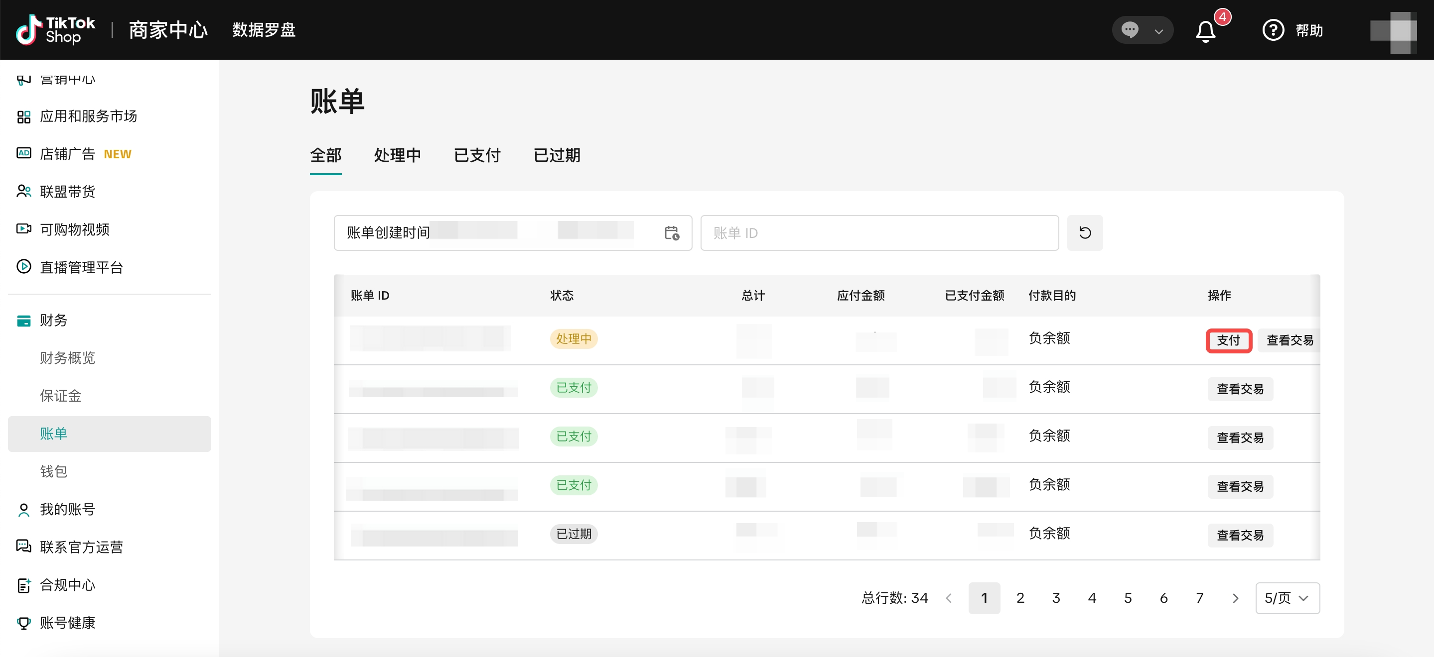 | 第6步 | 在账单页面可查询所有支付记录,账单的支付状态包括: – 已支付:支付成功。 – 处理中:支付未完成。点击“支付”继续操作: – 若点击支付后显示银行仍在处理中,您可耐心等待状态更新。 – 若点击支付后跳转至收银台页面,您可输入付款信息以完成付款。 – 已过期:支付失败或超时(30分钟内未完成)。 *请注意,支付成功后系统可能需要几分钟至4小时更新负余额。若支付成功后仍显示负余额横幅,请耐心等待系统更新。 | ![]() ![]() |