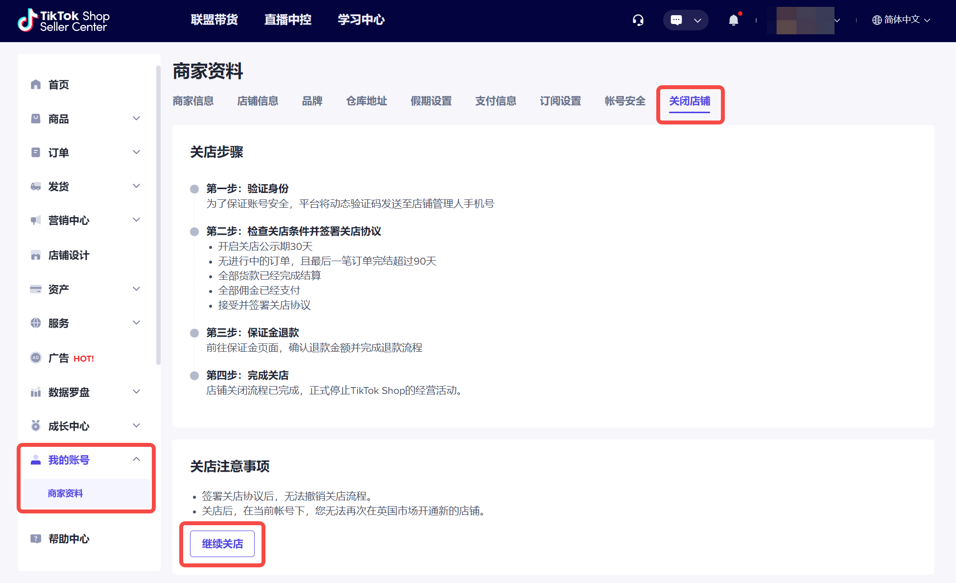步骤一:在PC端登录商家后台>>我的账号>>商家资料,点击“关闭店铺”,您需要仔细阅读页面上的关店步骤和注意事项,然后点击“继续关店”进入正式的关店申请环节。