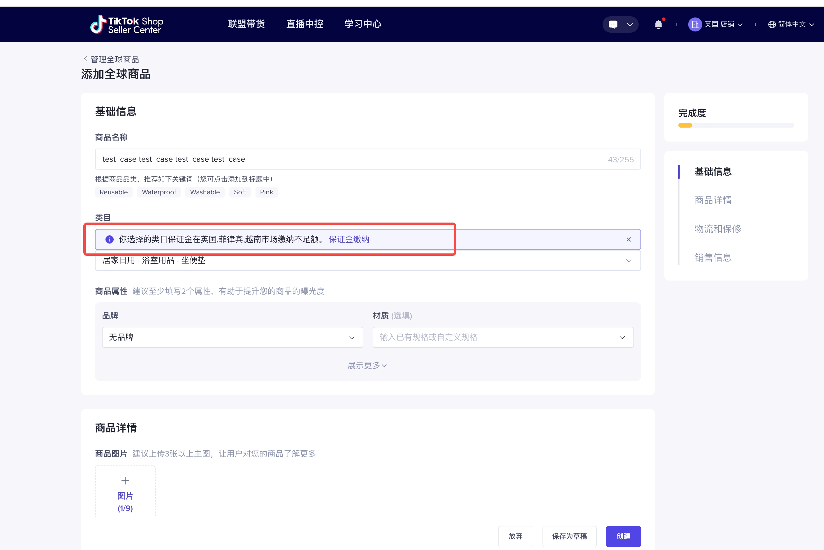 如您未缴纳店铺保证金,您将无法完成商品发布,并且无法绑定达人。