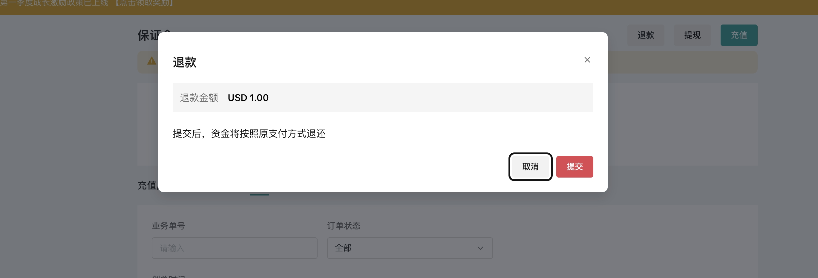 - 在保证金管理页面下方,系统展示保证金充值流水记录。您也可以使用筛选功能查询具体的保证金明细。如出现余额不对/支付结果不一致的情况,请您通过帮助中心创建工单联系平台客服获得帮助。