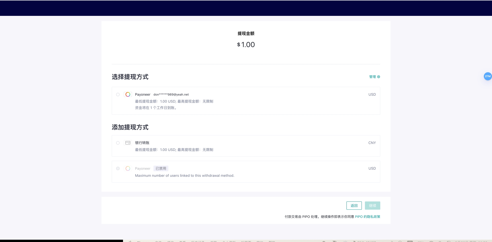 步骤三:您需要在收银台绑定具体的提现方式,其因公司主体所在地不同有所不同: