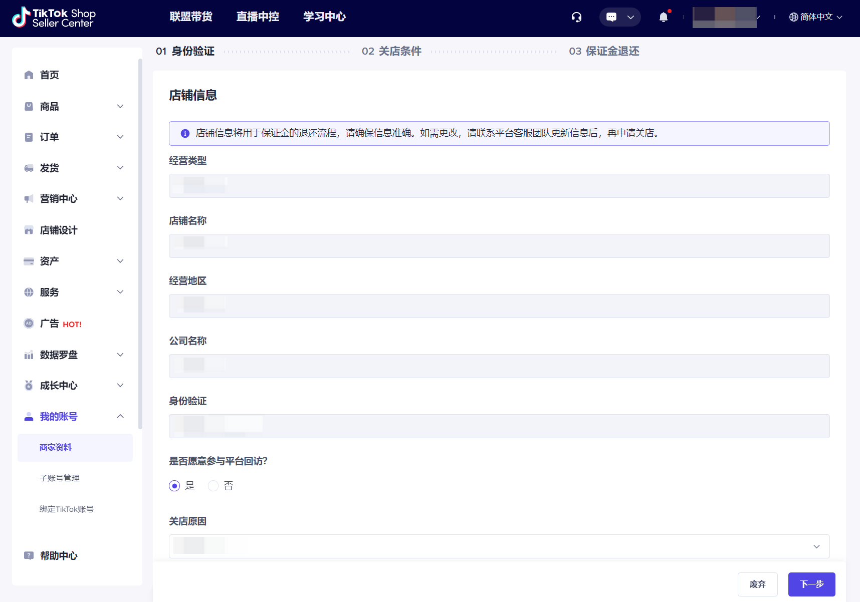 步骤二:身份验证。请确认展示的店铺信息与实际情况一致,若不一致,请在商家后台>>帮助中心联系客服团队更新信息。您还需通过验证码核实身份,并填写关店原因,完成后点击“下一步”,进入关店条件的校验环节。