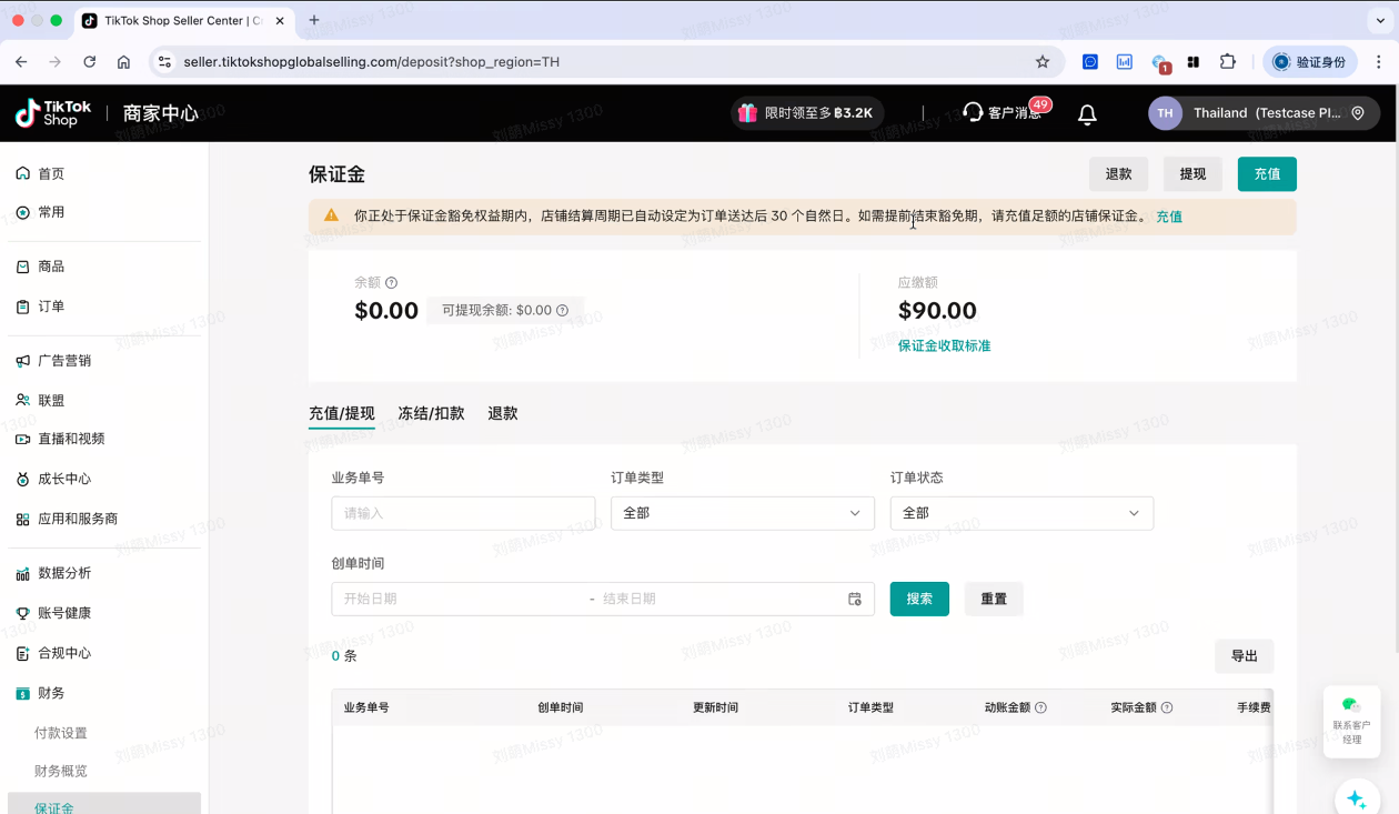 选择【享受90天豁免期】的商家保证金充值界面展示如下,提醒商家在保证金豁免期内(最高90天)同时店铺结算账期将会自动变成订单送达后30个自然日,账期相关指南:《跨境卖家帐期结算规则(东南亚)》,如果卖家想提前结束保证金豁免期恢复结算账期,也可选择主动充值保证金。