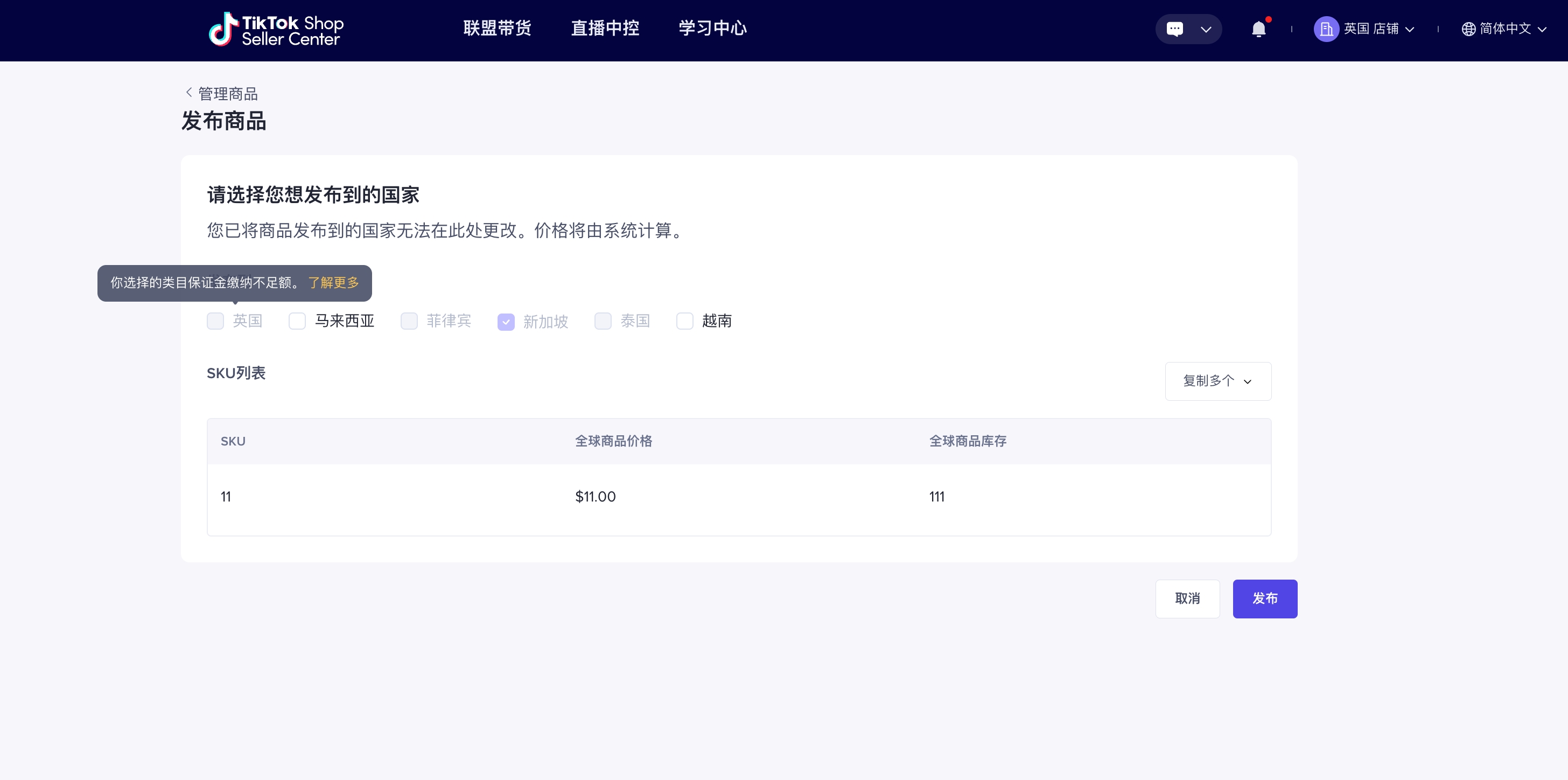 如您未足额缴纳保证金,您将无法完成新商品的发布。