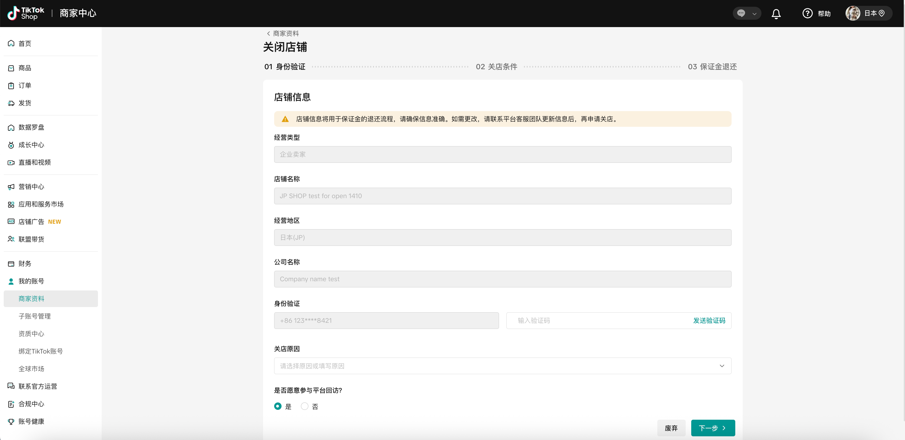 步骤二:身份验证。请确认展示的店铺信息与实际情况一致,若不一致,请在商家后台>>帮助中心联系客服团队更新信息。您还需通过验证码核实身份,并填写关店原因,完成后点击“下一步”,进入关店条件的校验环节。