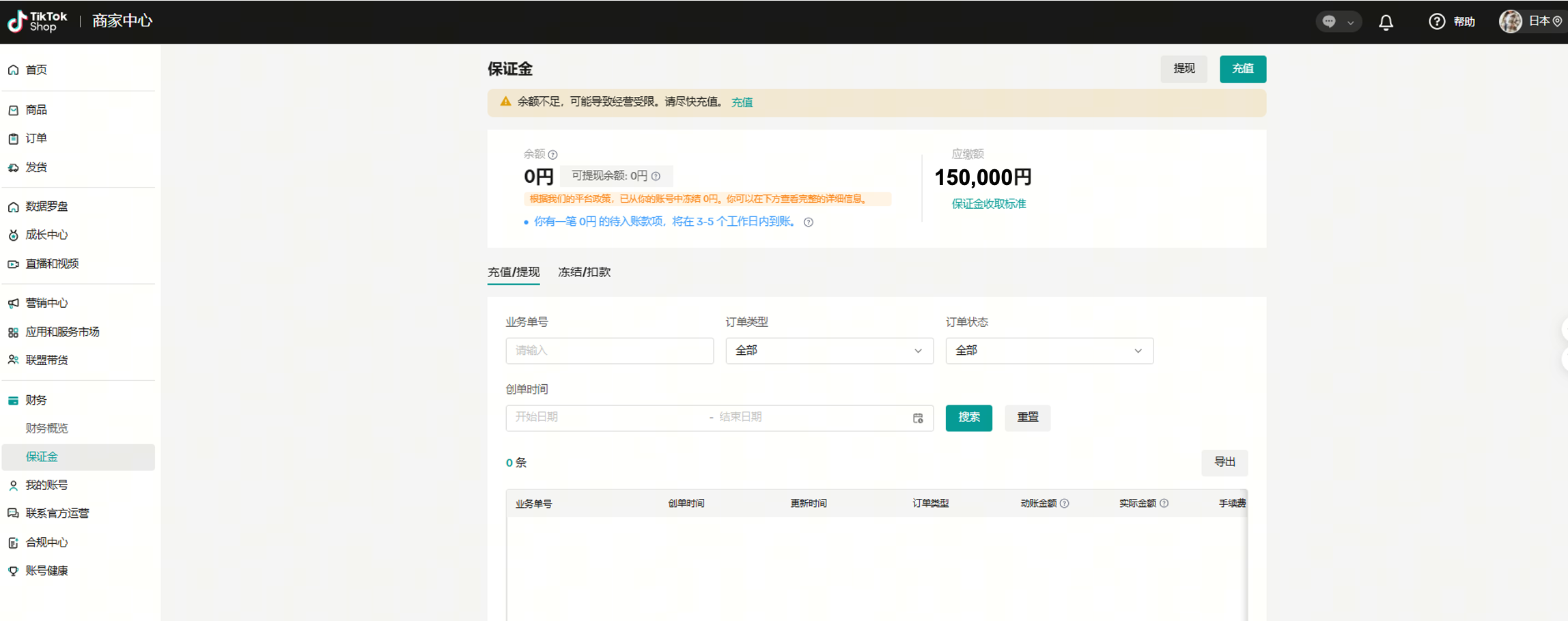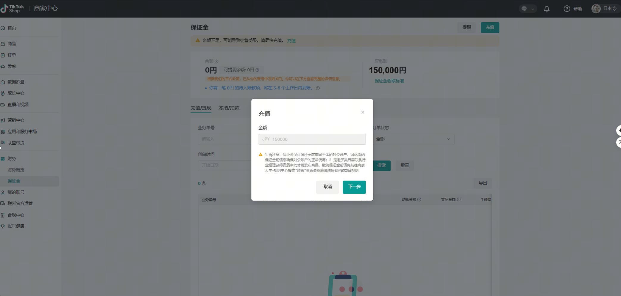 所有TikTok Shop的日本跨境自运营店铺都需要缴纳保证金。店铺保证金将按照店铺维度收缴,每个店铺需充值15万日元保证金。