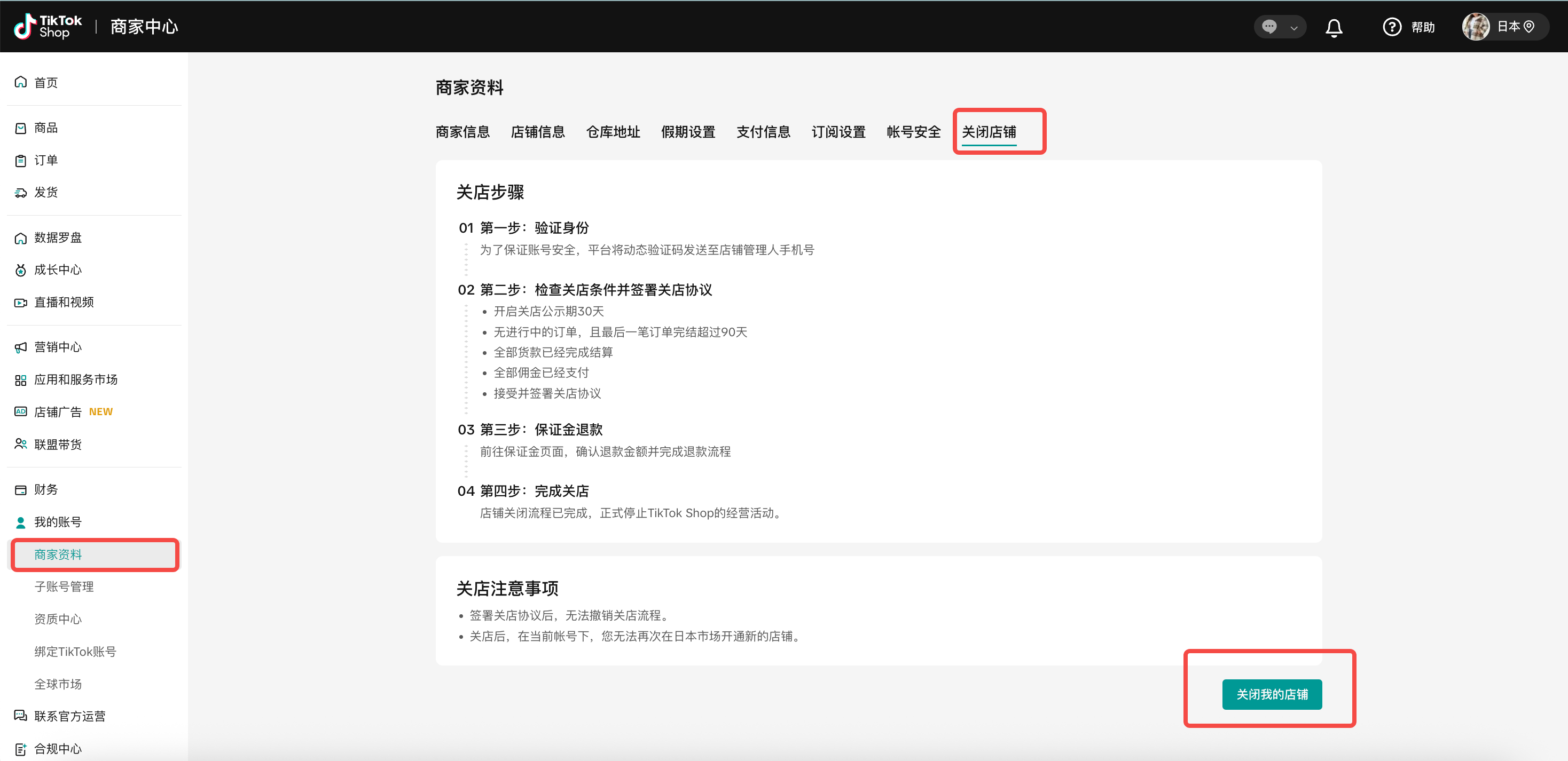 步骤一:在PC端登录商家后台>>我的账号>>商家资料,点击“关闭店铺”,您需要仔细阅读页面上的关店步骤和注意事项,然后点击“关闭我的店铺”进入正式的关店申请环节。