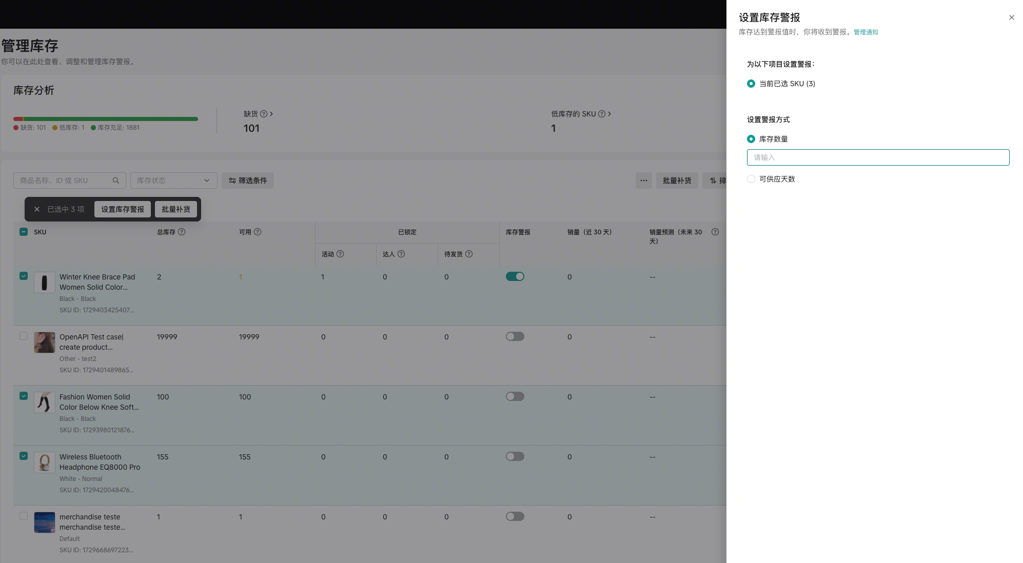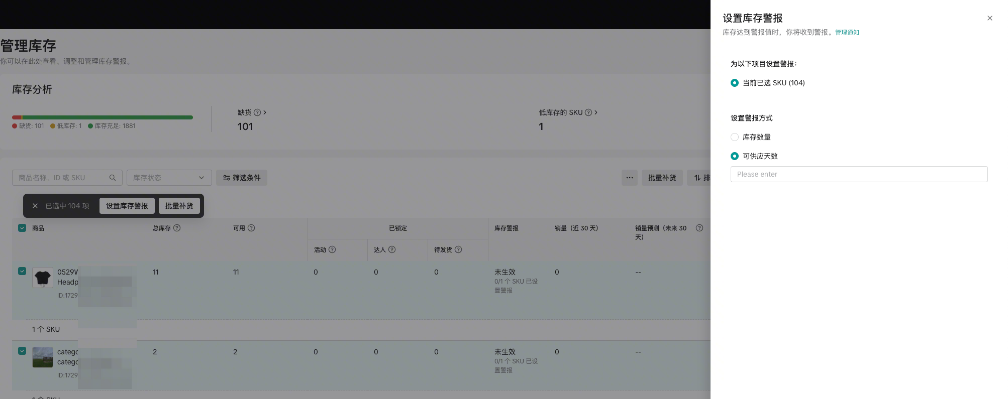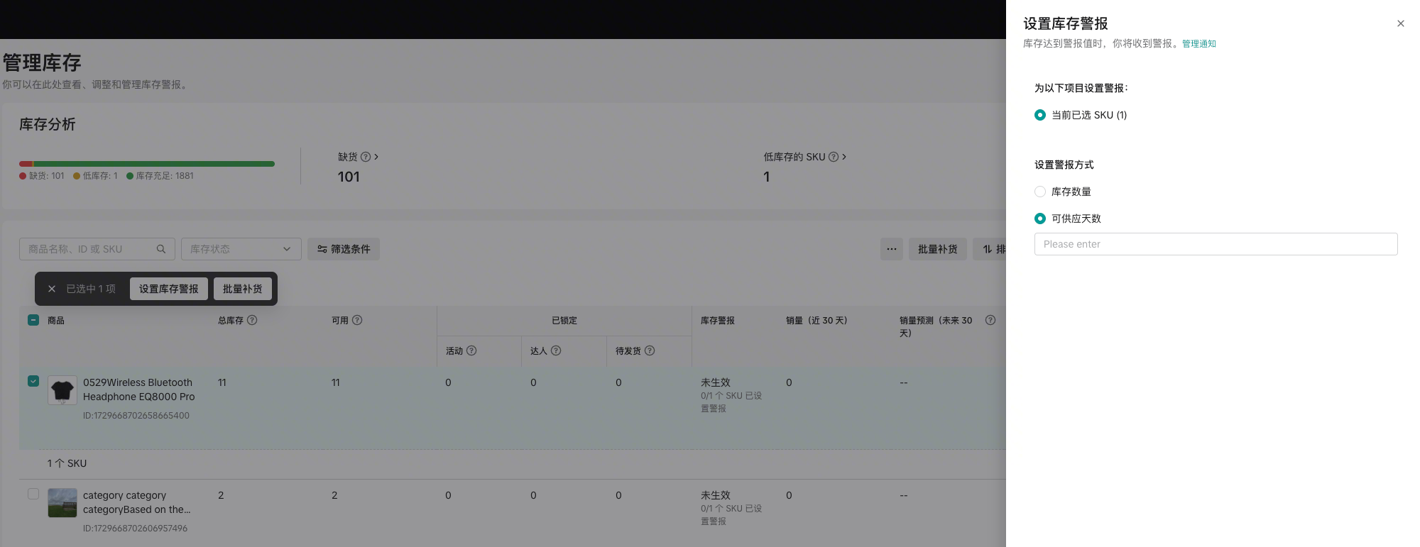 你可以为每个 SKU 选择一种最适合的预警方式。同一 SKU 只能设置一种预警规则。​