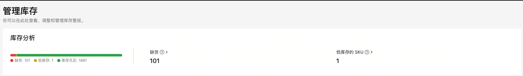 页面顶部会根据你的店铺情况显示不同的提醒横幅,帮助你快速识别并处理紧急库存问题。​