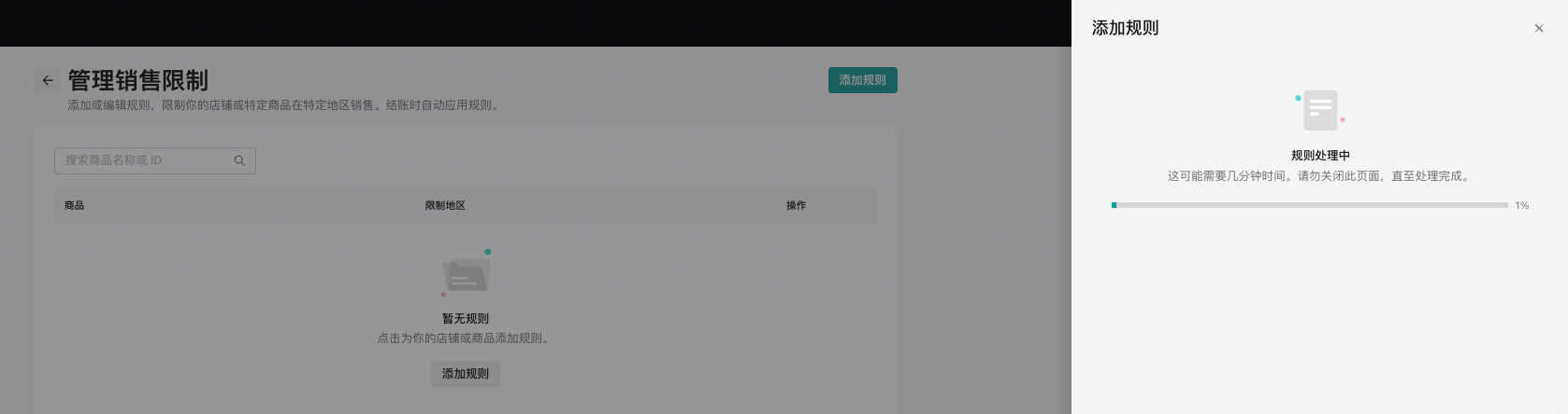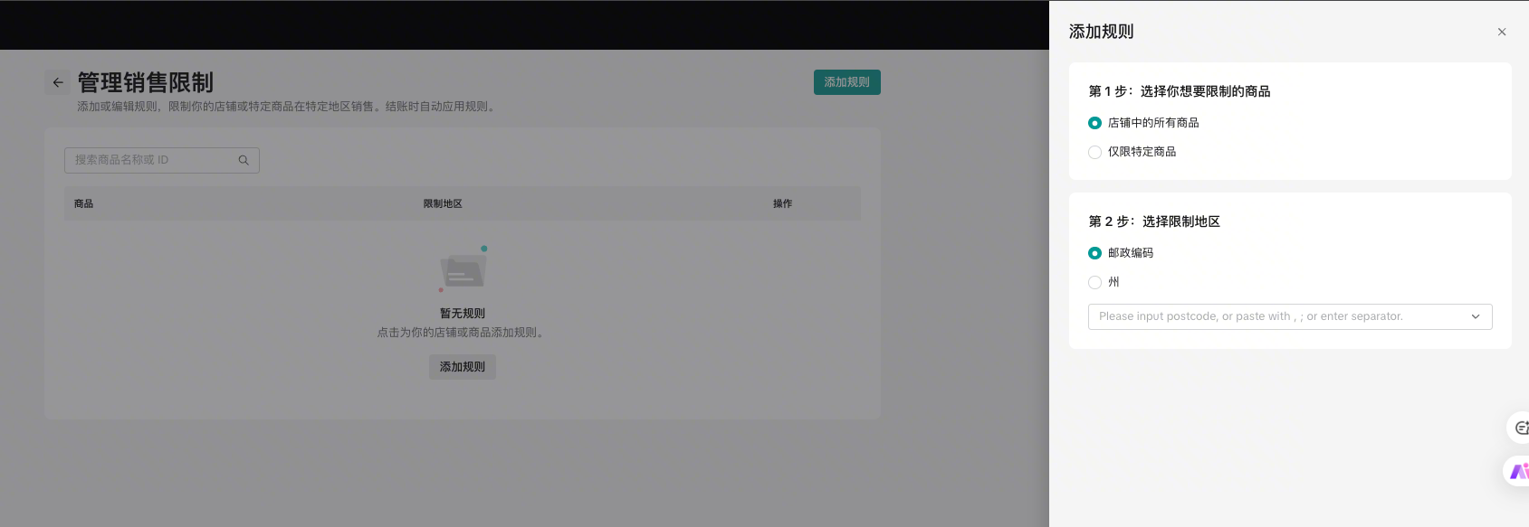 设置过程非常简单,只需三步即可完成。请注意,每次只能创建一个规则,请确保您已规划好本次要限制的商品和区域。​