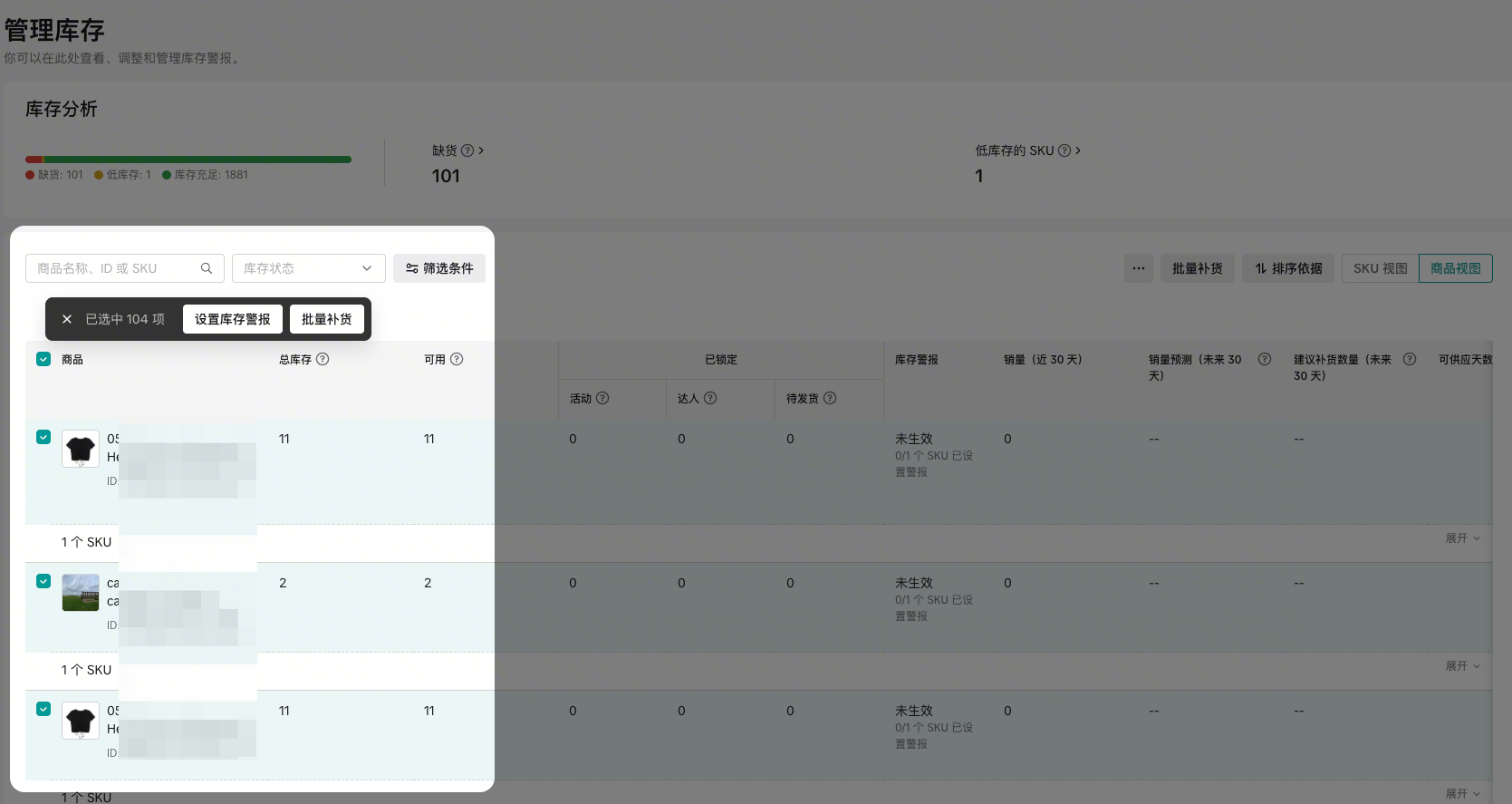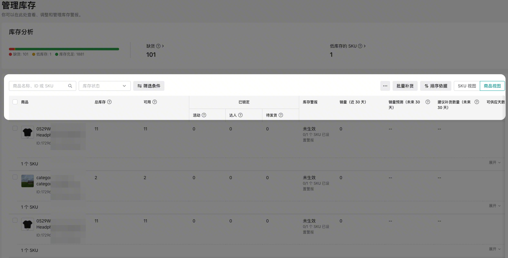 库存总览区以卡片形式展示了你店铺中所有商品的关键库存状态,让你对整体库存健康度一目了然。​