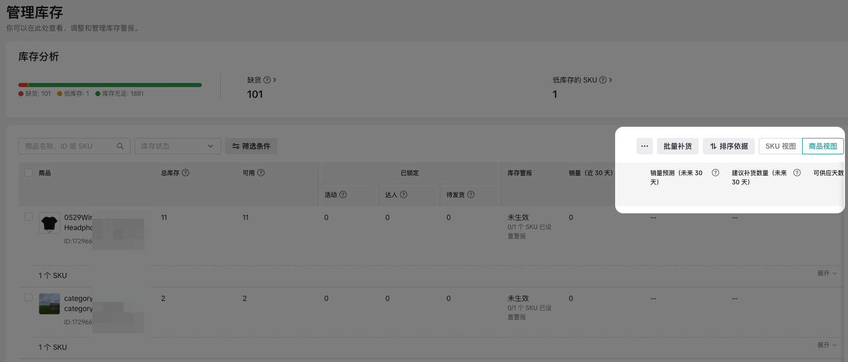 • 商品视图:将同一商品(Product ID)下的所有 SKU 进行聚合展示,方便你从商品整体视角管理库存。系统会自动记录你的偏好,下次访问时将默认展示你上次使用的视图。​