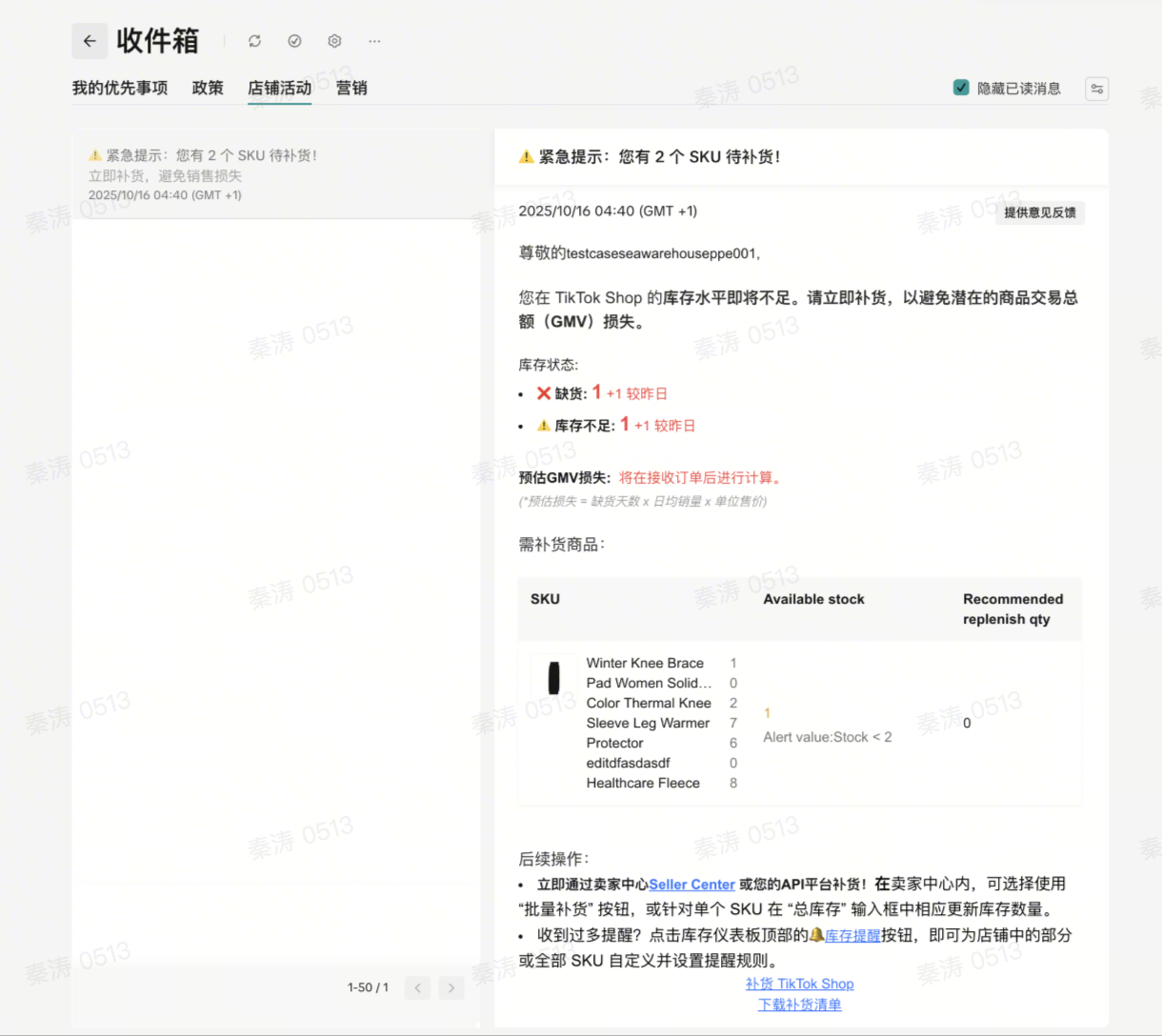 A3:关闭“通知设置”后,你将不会再通过邮件、消息中心或 App 推送收到任何形式的补货提醒。但是,在“库存管理”页面,相关商品依然会被标记为“低库存”状态,你仍然可以手动筛选和查看它们。​
