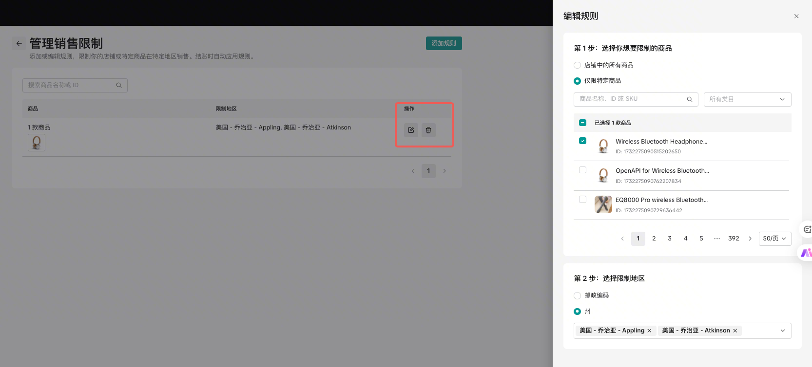 • 编辑规则:点击 编辑,您可以像创建时一样修改限售的商品或区域范围。修改后提交即可生效。​