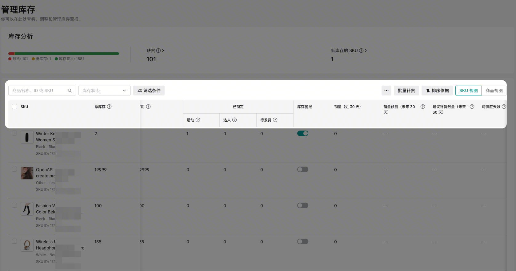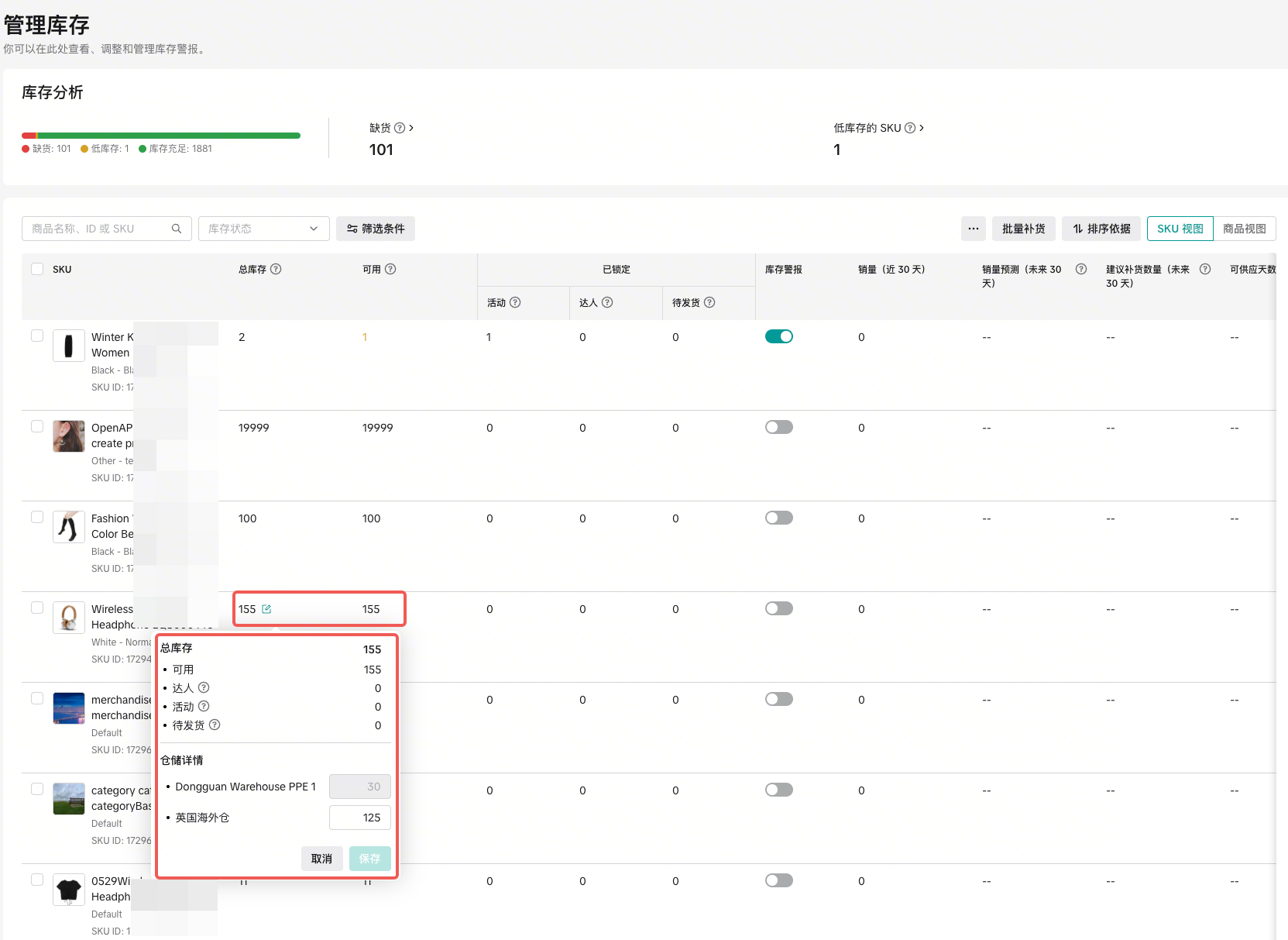 库存预警 (Stock Alert)​显示该 SKU 的预警开关状态(开/关)。​