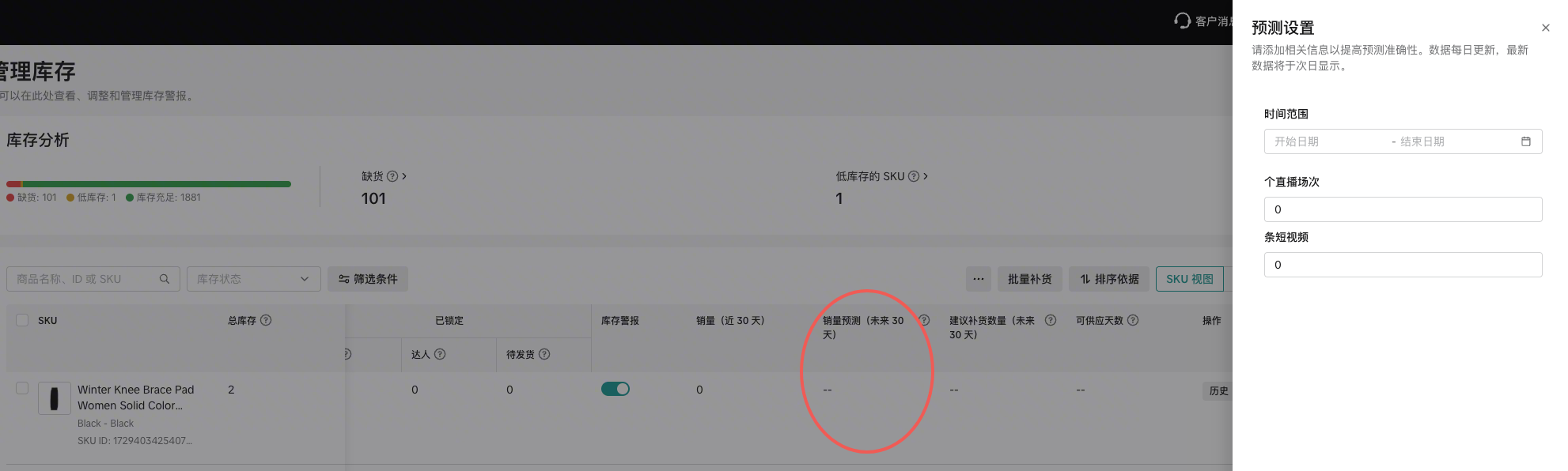 预估销量 (x 天)​系统预测的未来一段时间内的总销量。同样,悬停可查看每日预测趋势。你还可以单击设置图标,输入未来的直播、短视频计划等信息,帮助算法提升预测准确率。​