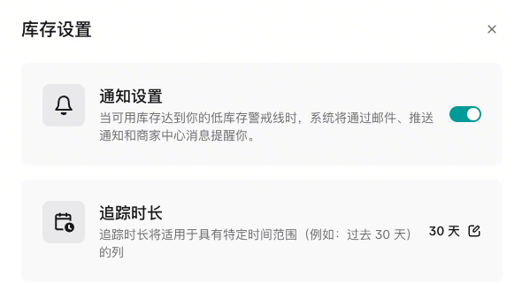 • 通知设置 (Notification Settings):开启(默认)或 关闭 库存预警的补货通知。关闭后,你将不会通过邮件、消息中心或 App 推送收到任何补货提醒。​