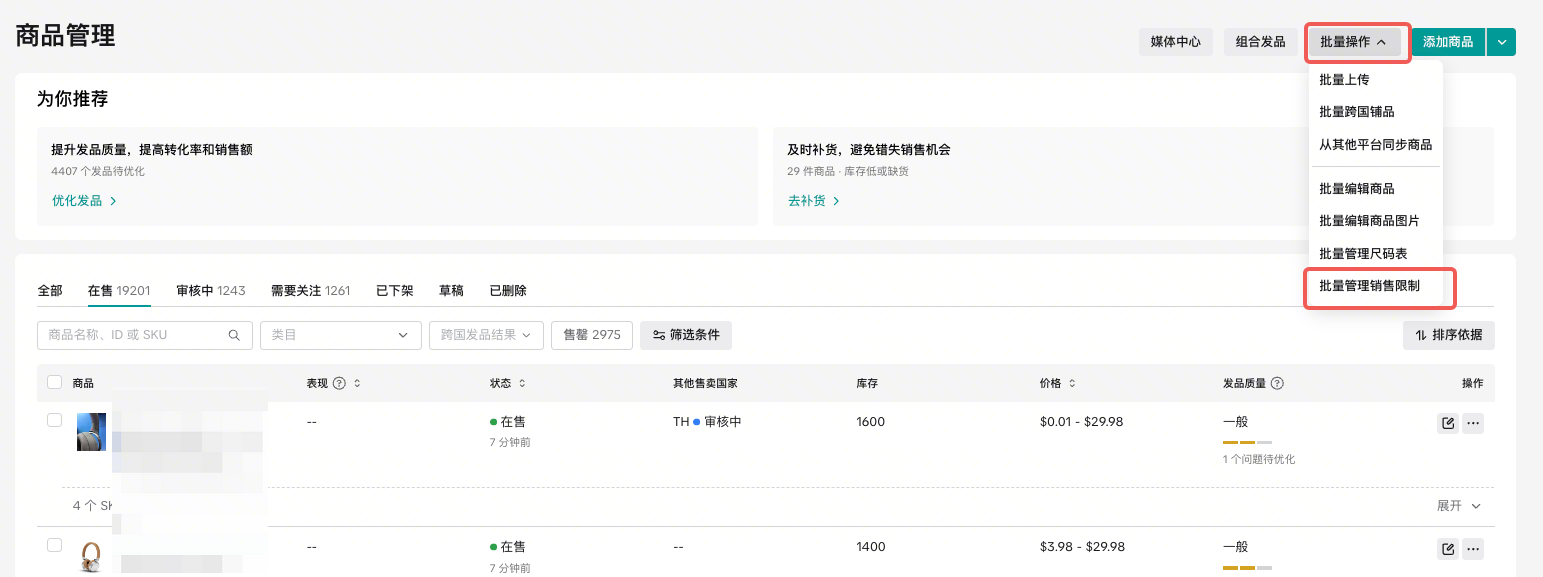 第一步:选择您要限制销售的商品​