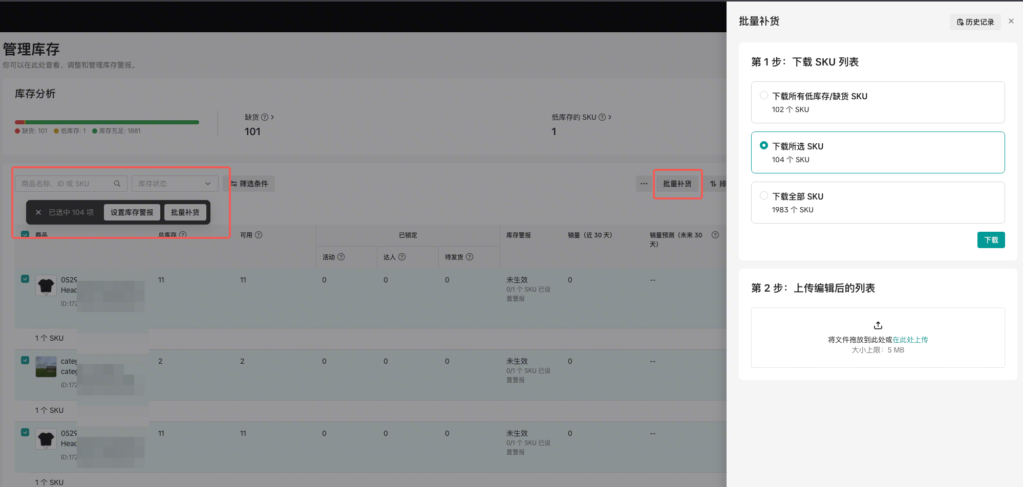 • 批量补货 (Bulk Restock):这是一个非常高效的工具,让你通过上传 Excel 文件一次性更新大量商品的库存。​