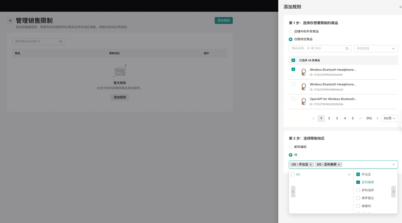 第二步:选择您要限制销售的区域​