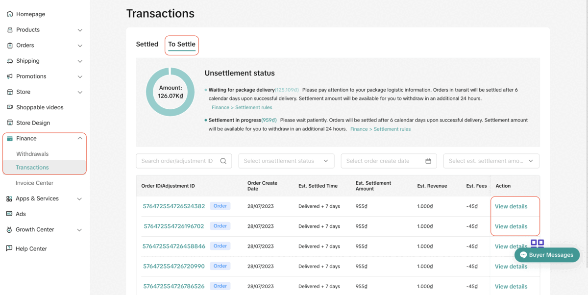 - 对于尚未结算的订单,您可以在TikTok Shop卖家中心 -> 财务 -> 交易 -> 待结算 -> 查看详情中查看交易费。