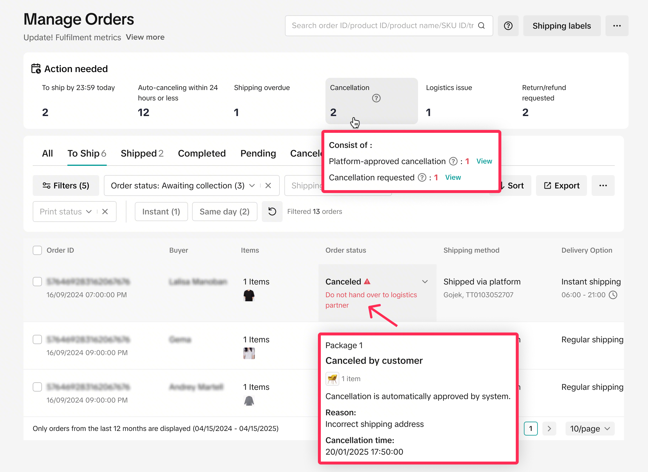 Now you can manage cancellations faster than ever. Use the new Cancellation quick filter on the Manage Orders page to instantly see platform-approved and pending cancellation requests. We’ve also added clear alerts like ‘Do not hand over to logistics partner’ on the order card to help you process orders more easily.