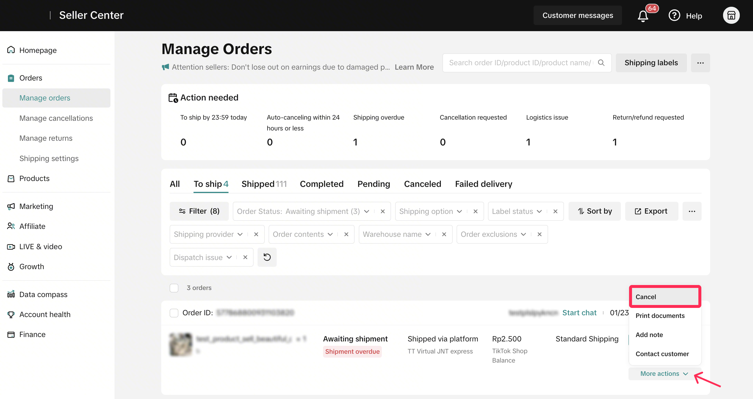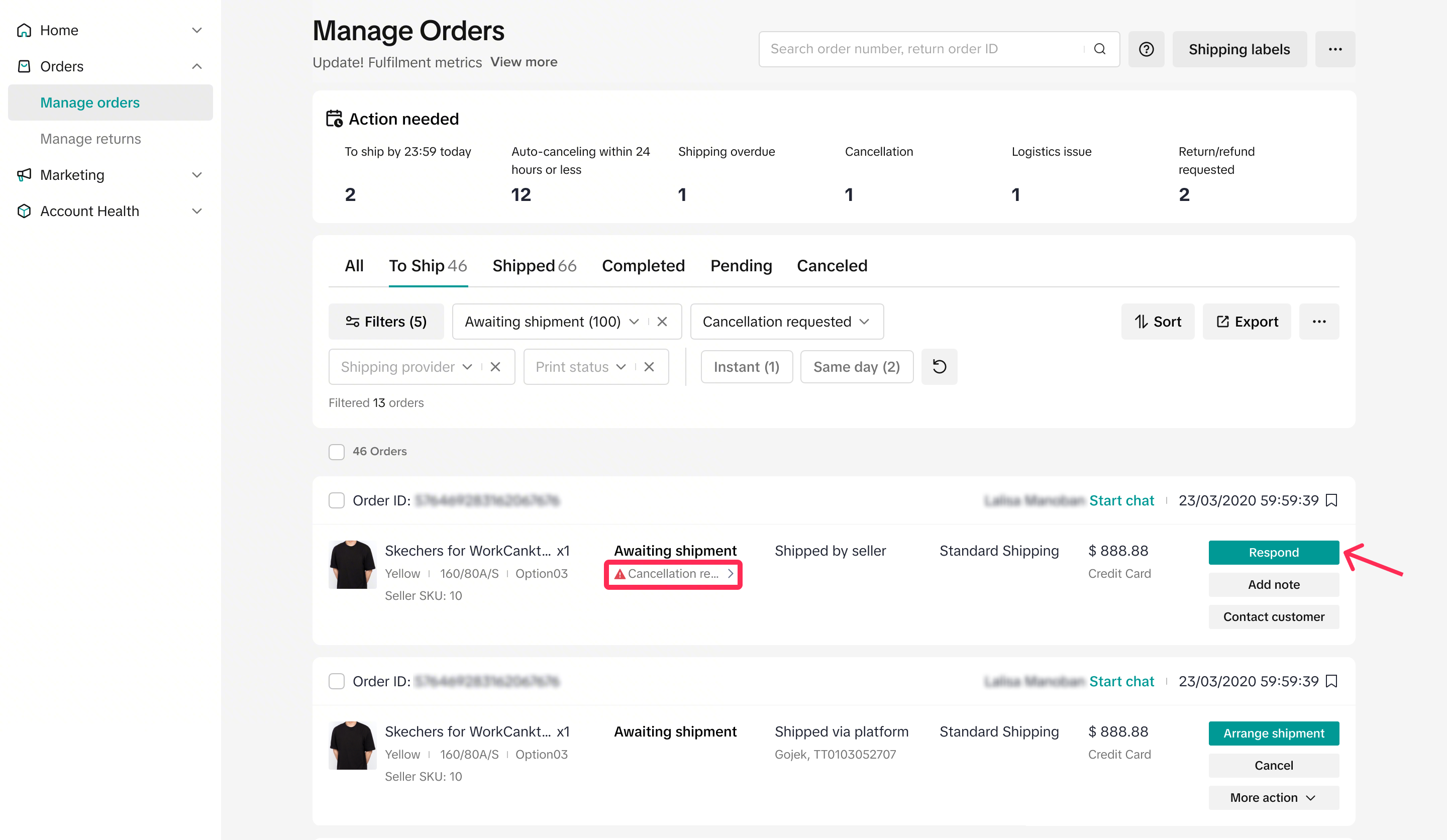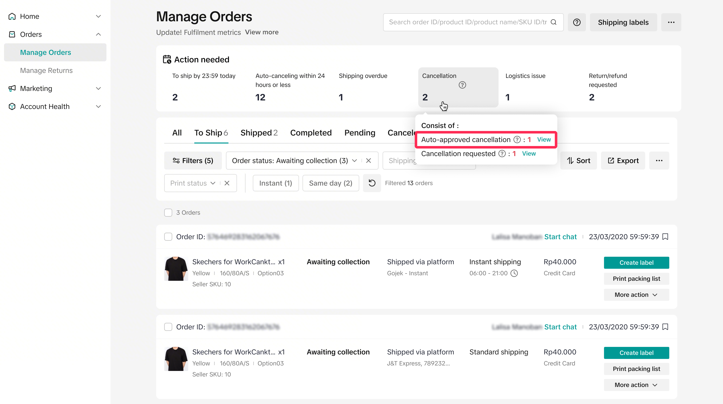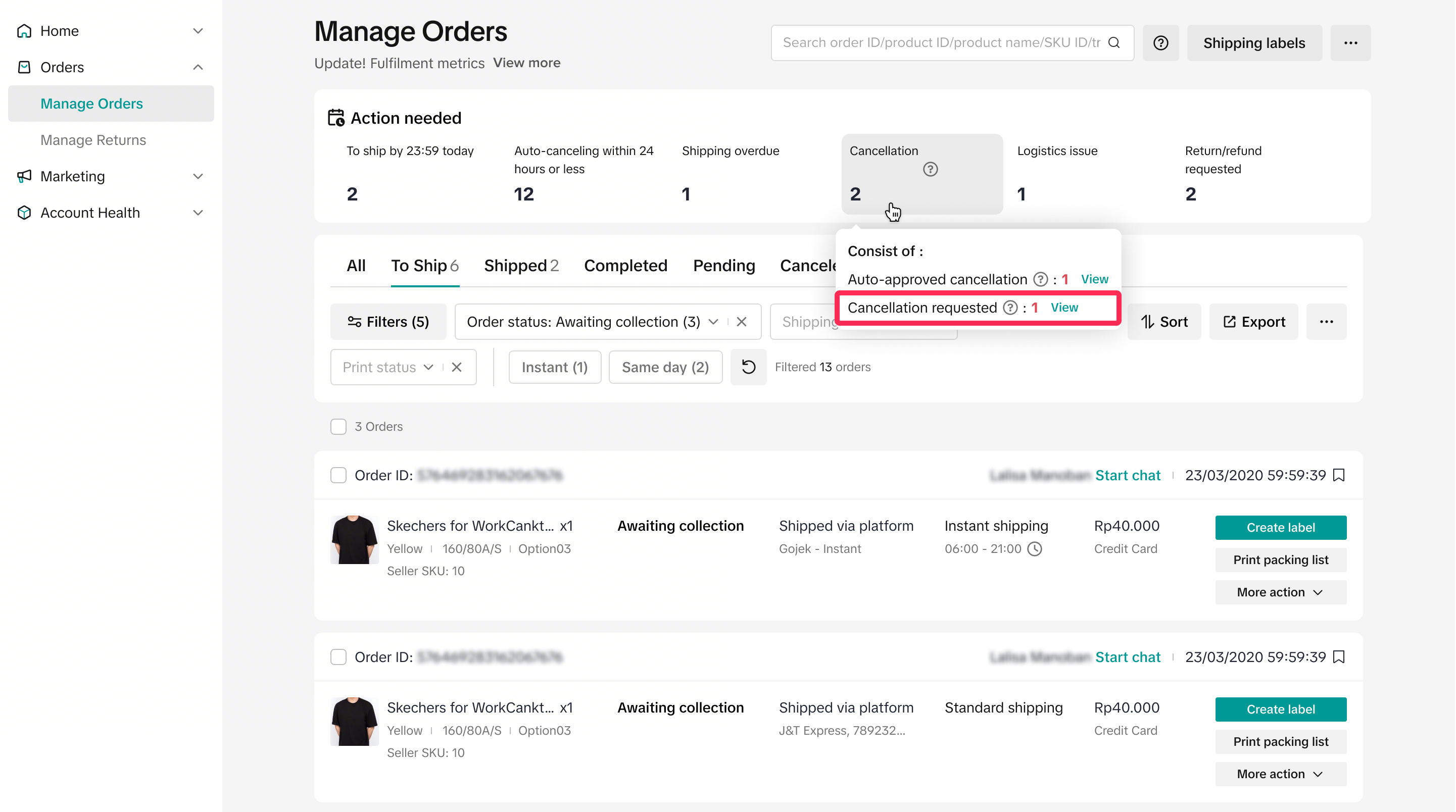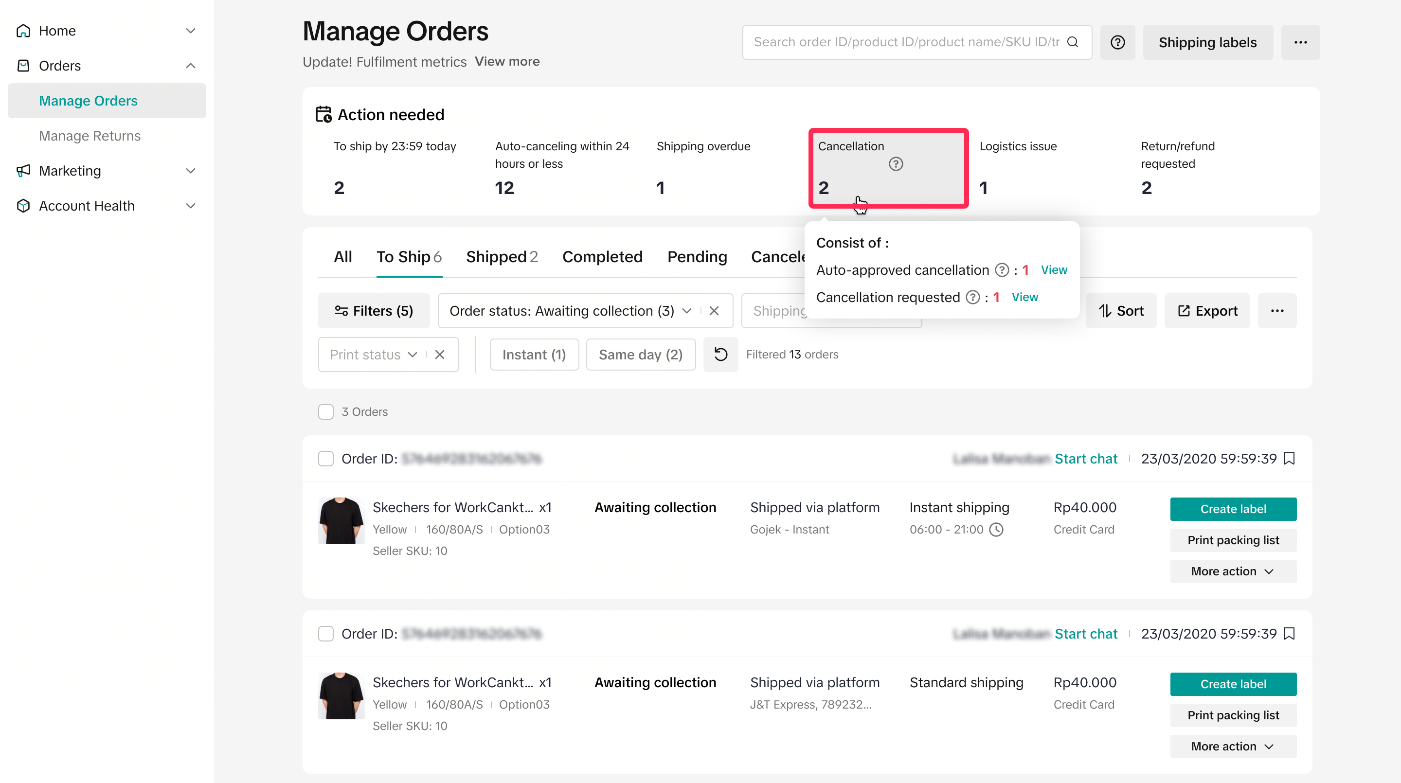- On the Manage Orders page, you’ll find the ‘Action Needed’ tab. This gives you a quick overview of the number of cancellations you’ve received. Clicking on the ‘Cancellation’ filter will redirect you to the ‘All’ tab, where you can see all auto-approved cancellations and cancellation requests you’ve received.