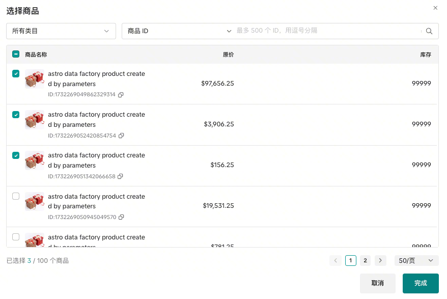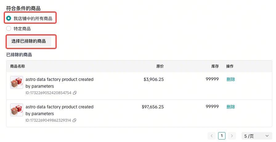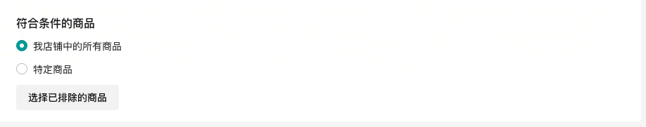 - 配置参与活动的商品:支持全店商品和特定商品,当选择全店商品时,支持针对指定商品排除设置,操作更快捷;