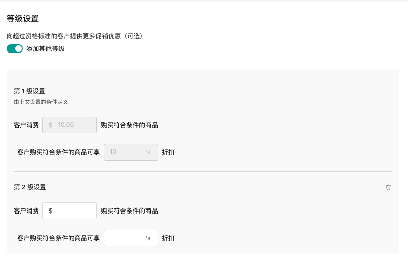 等级设置:如果您想在购买更多产品后给予更大折扣,您可以按层级设置,目前卖家最多可以设置2层折扣;