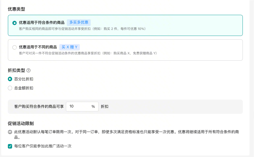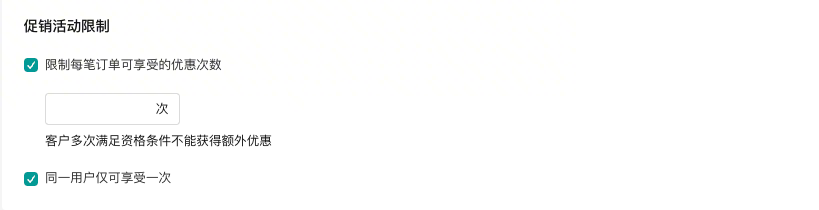 促销活动限制:可以选择将优惠限制为每笔订单1次,或者允许客户在同一购物车中多次满足条件,多次获得优惠;