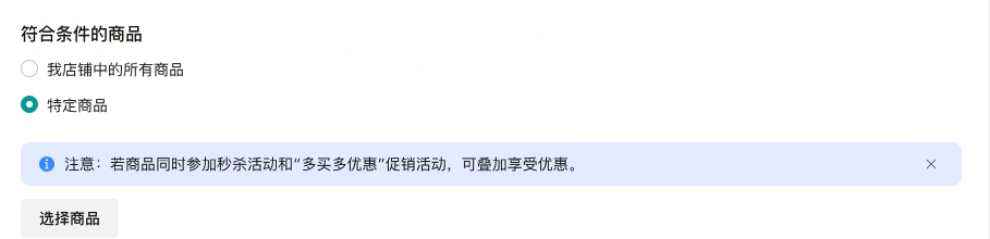 同一时间段内已入选秒杀、商品组合促销的商品不能再参与多买优惠促销