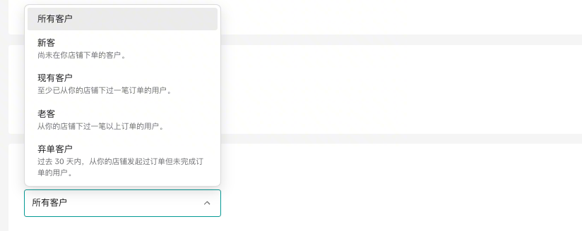 - 设置活动面向的用户:支持新客、现有客户、老客和弃单客户;