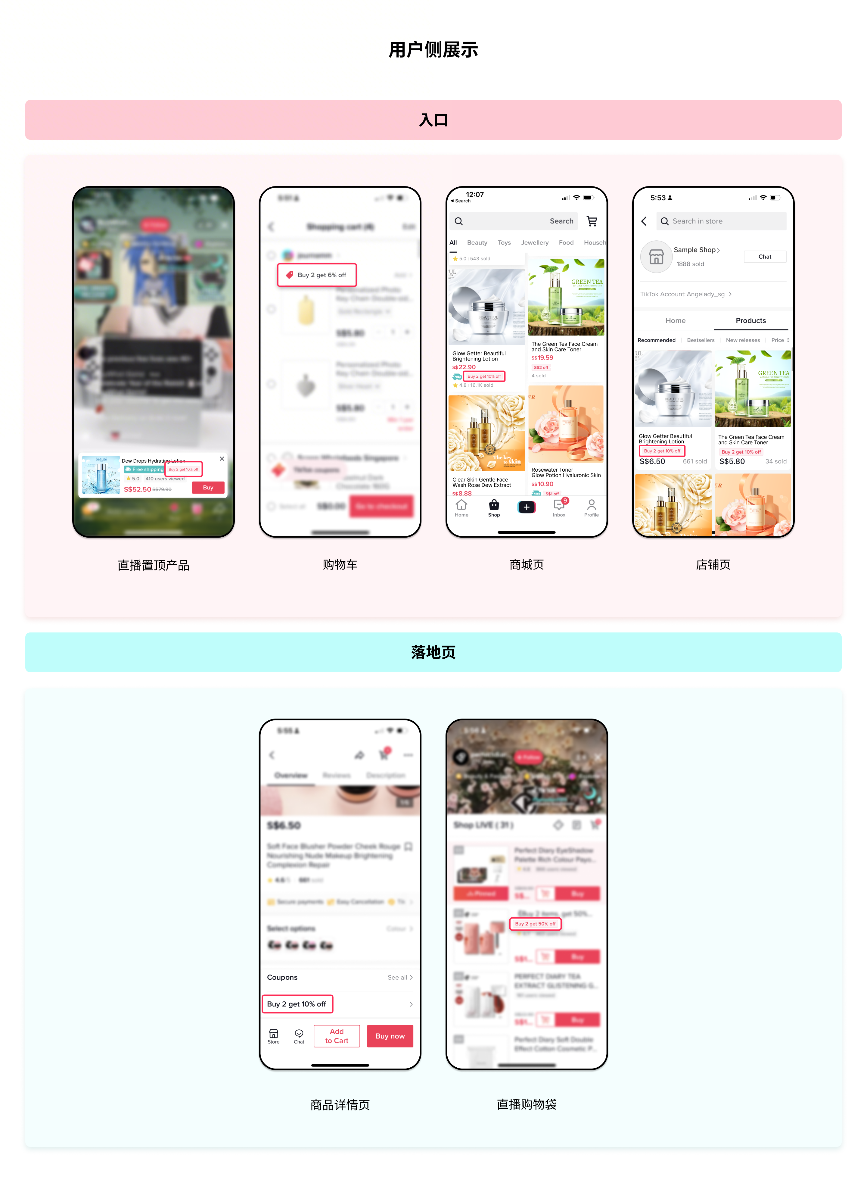| 营销工具 | 多件多折样式 | 直播间 | 直播间购物袋 | 购物车 | 商详页 | 落地页 | 橱窗 |