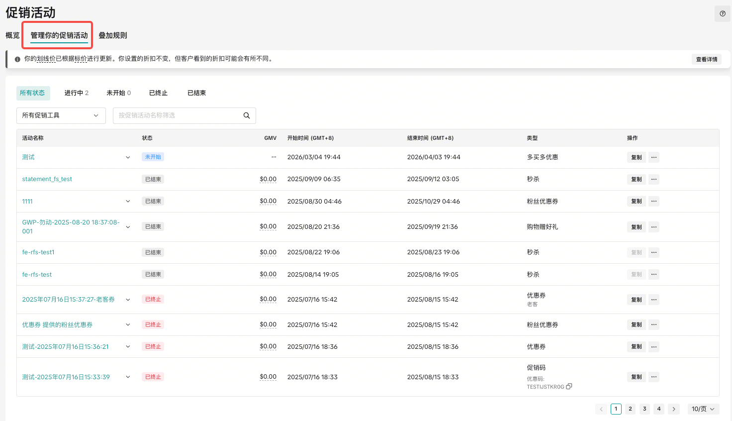 终止:单击以停用即将或正在进行的促销活动。