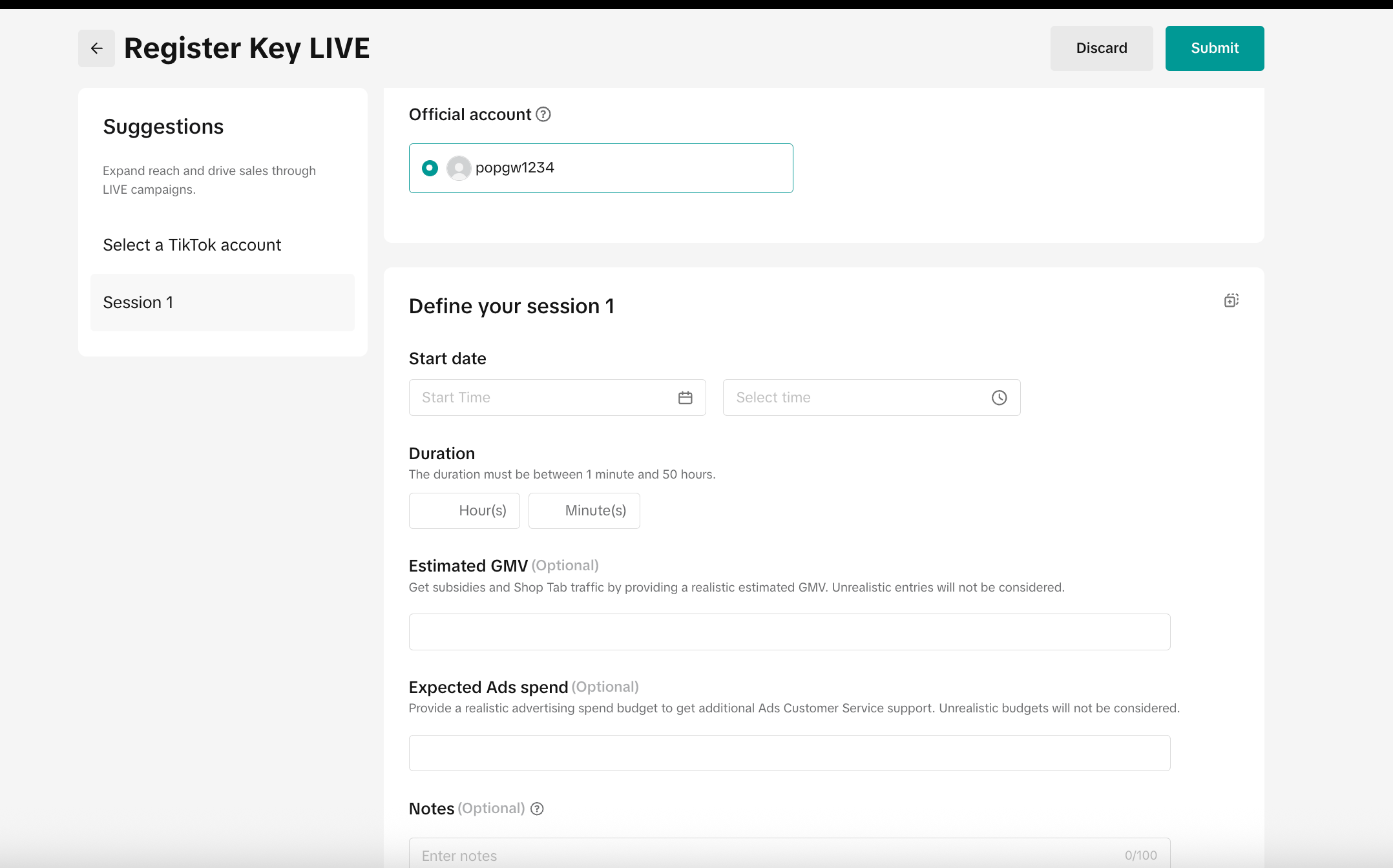 第二步:报名重点直播选择您想用于活动的官方 TikTok 账号。这是您成功报名后将进行直播的账号。您还可以输入预估的 GMV 和预期的广告花费。平台将利用这些信息来确定您直播间的适当补贴福利,例如发放优惠券和提供广告相关的客户服务支持。点击“提交”继续。