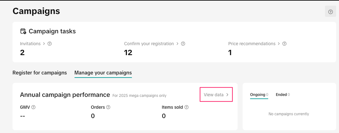在“商家中心”,前往 营销 → 活动 → 管理您的活动。在“管理您的活动”选项卡上,您可以查看所有活动的年度表现。要查看每个活动的详细分解,请点击 查看数据,它将把您重定向到分析页面。