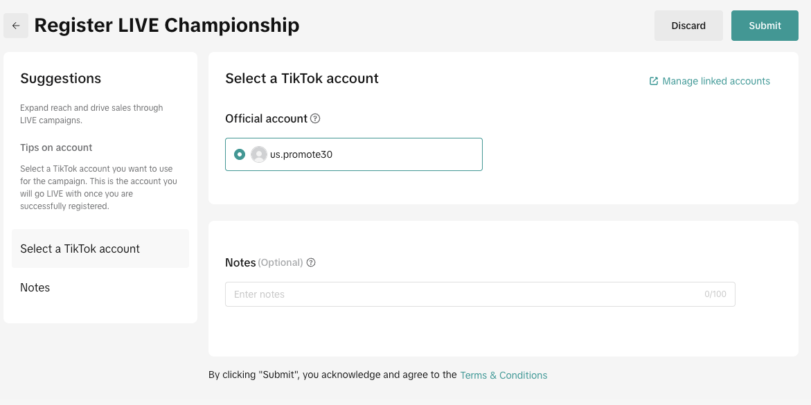 第二步:报名直播冠军赛选择您想用于活动的官方 TikTok 账号。这是您成功报名后将进行直播的账号。点击“提交”继续。