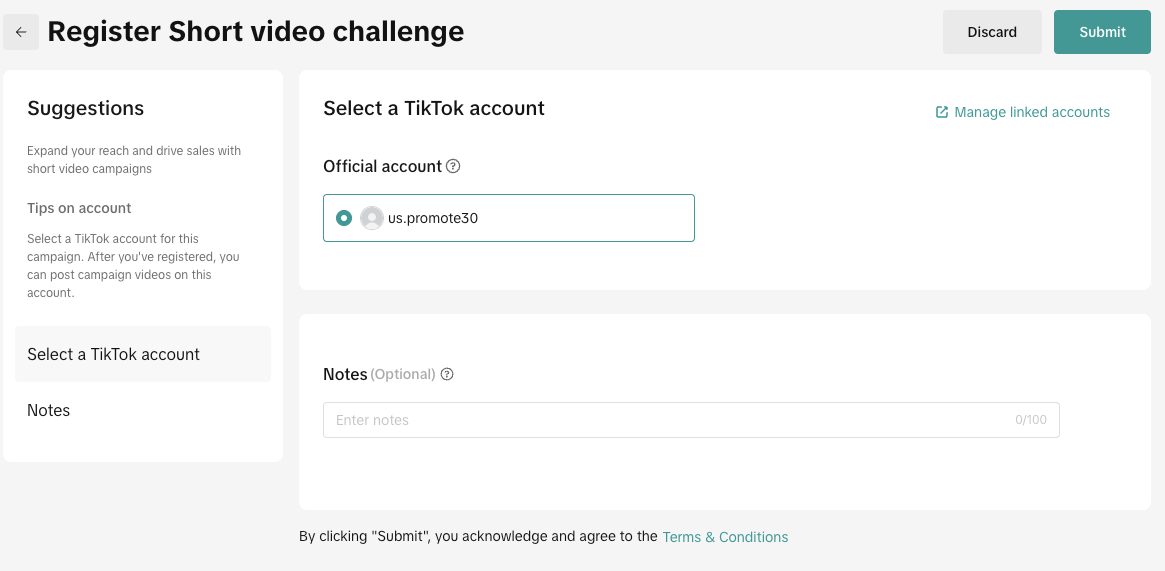 第二步:报名短视频挑战赛选择您想用于活动的官方 TikTok 账号。这是您成功报名后将发布视频的账号。点击“提交”继续。