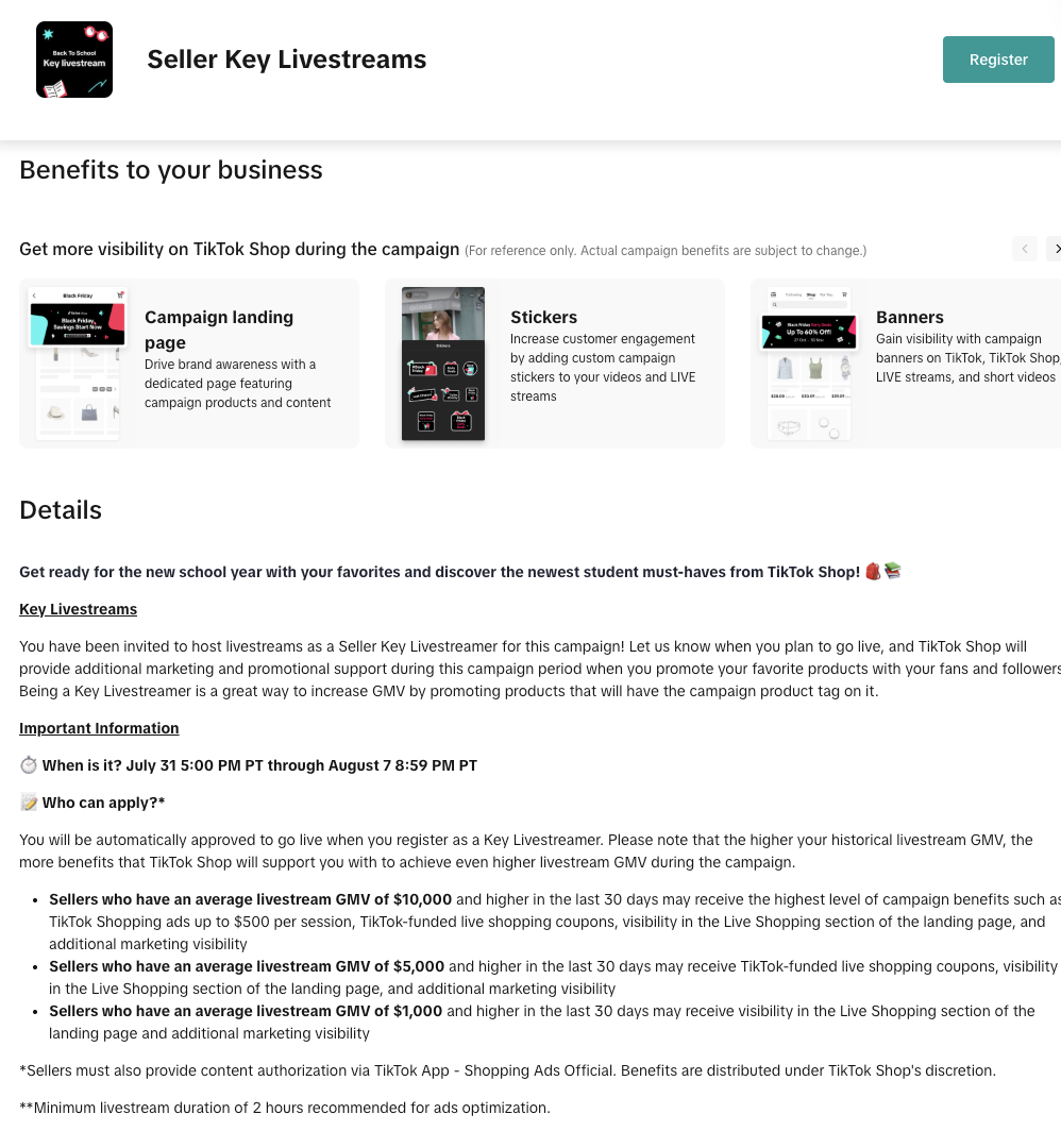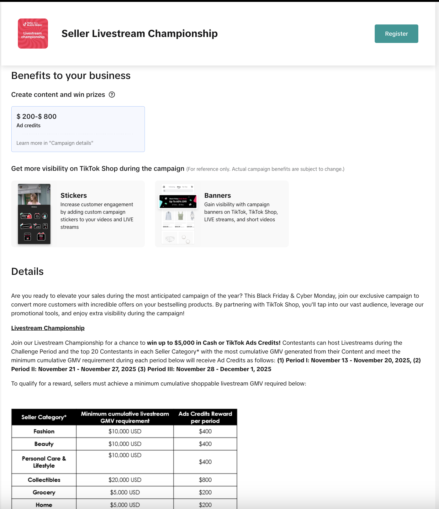 重点直播: 高影响力的直播,为参与者提供特殊福利,如直播优惠券或补贴、TikTok 购物广告积分和/或额外的营销支持。