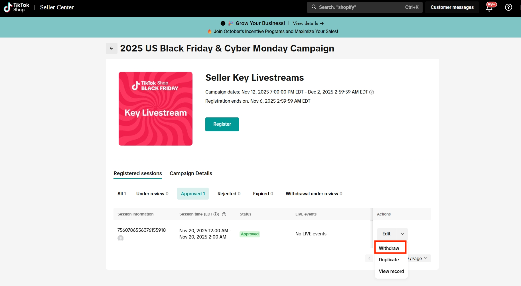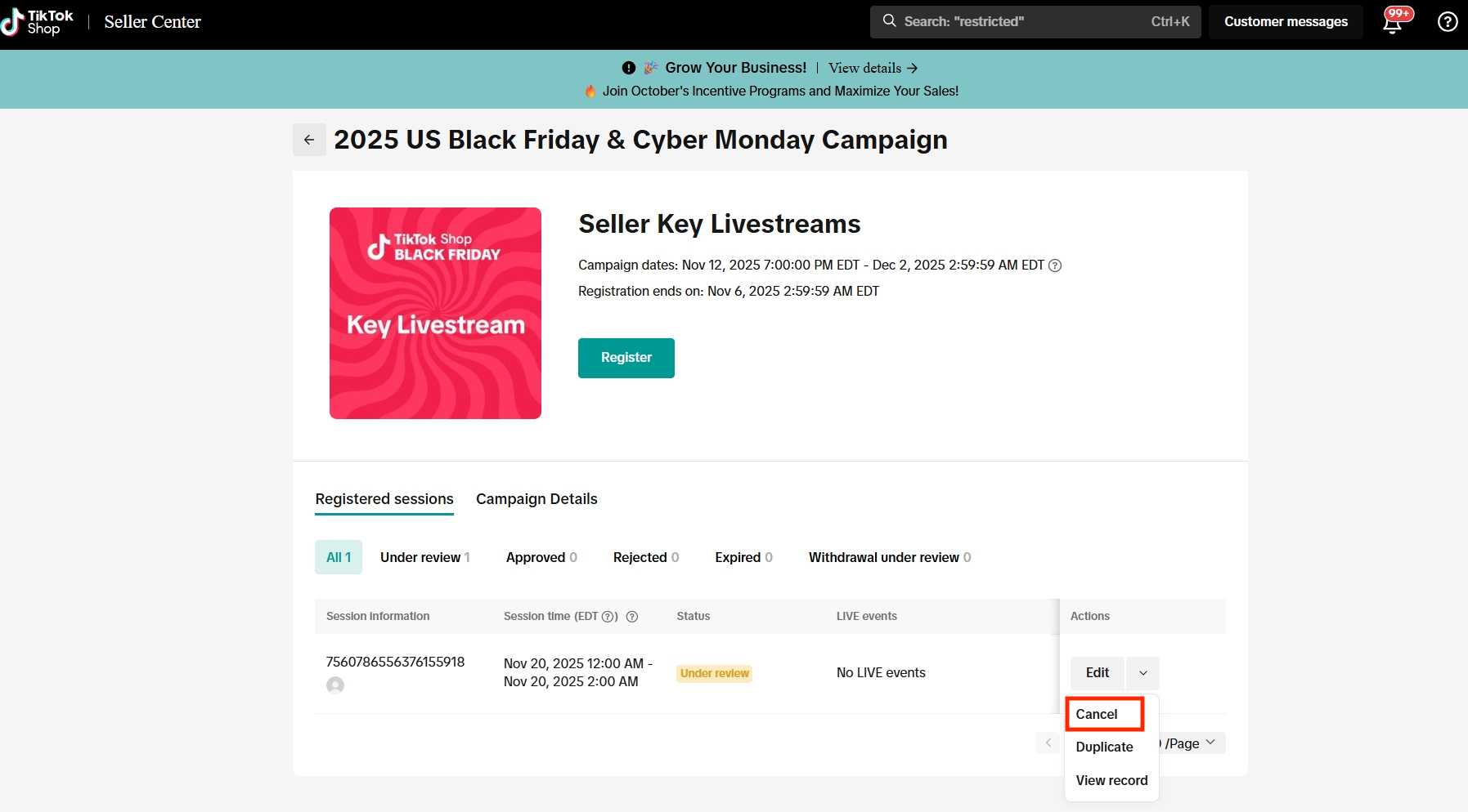 每个活动您最多可以报名 100 个场次(在“商家中心”和“直播管家”中合计)。超过此上限将阻止新的报名。