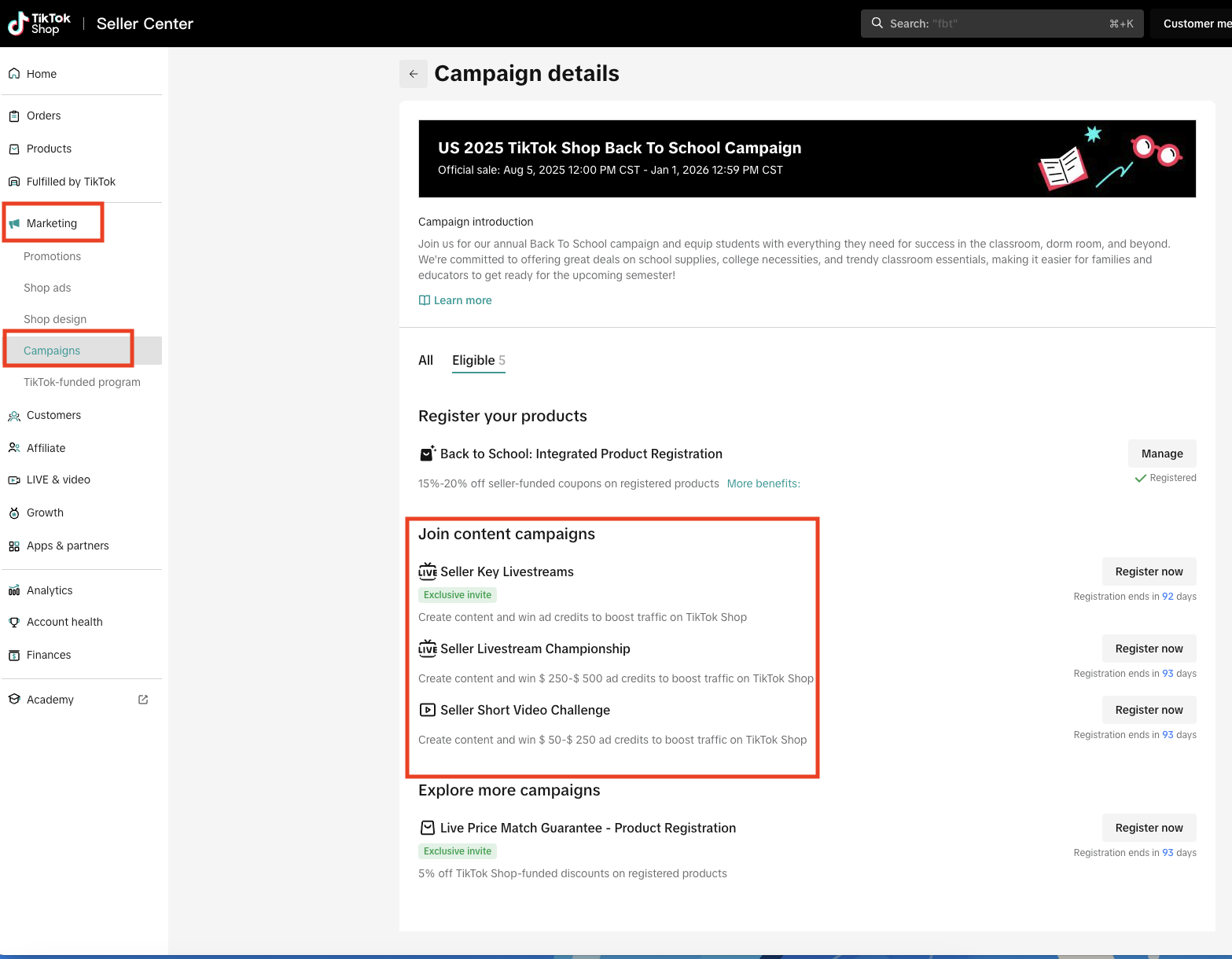 您必须在“商家中心”绑定您的官方 TikTok 账号才能报名。否则,您将看到阻止报名的通知。