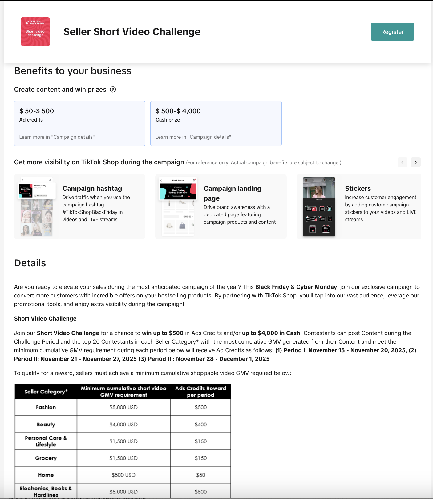 带有标签的视频可以在活动启动前 1-2 周发布,但只有在官方活动期间产生的 GMV 才会被计入奖励和表现指标。